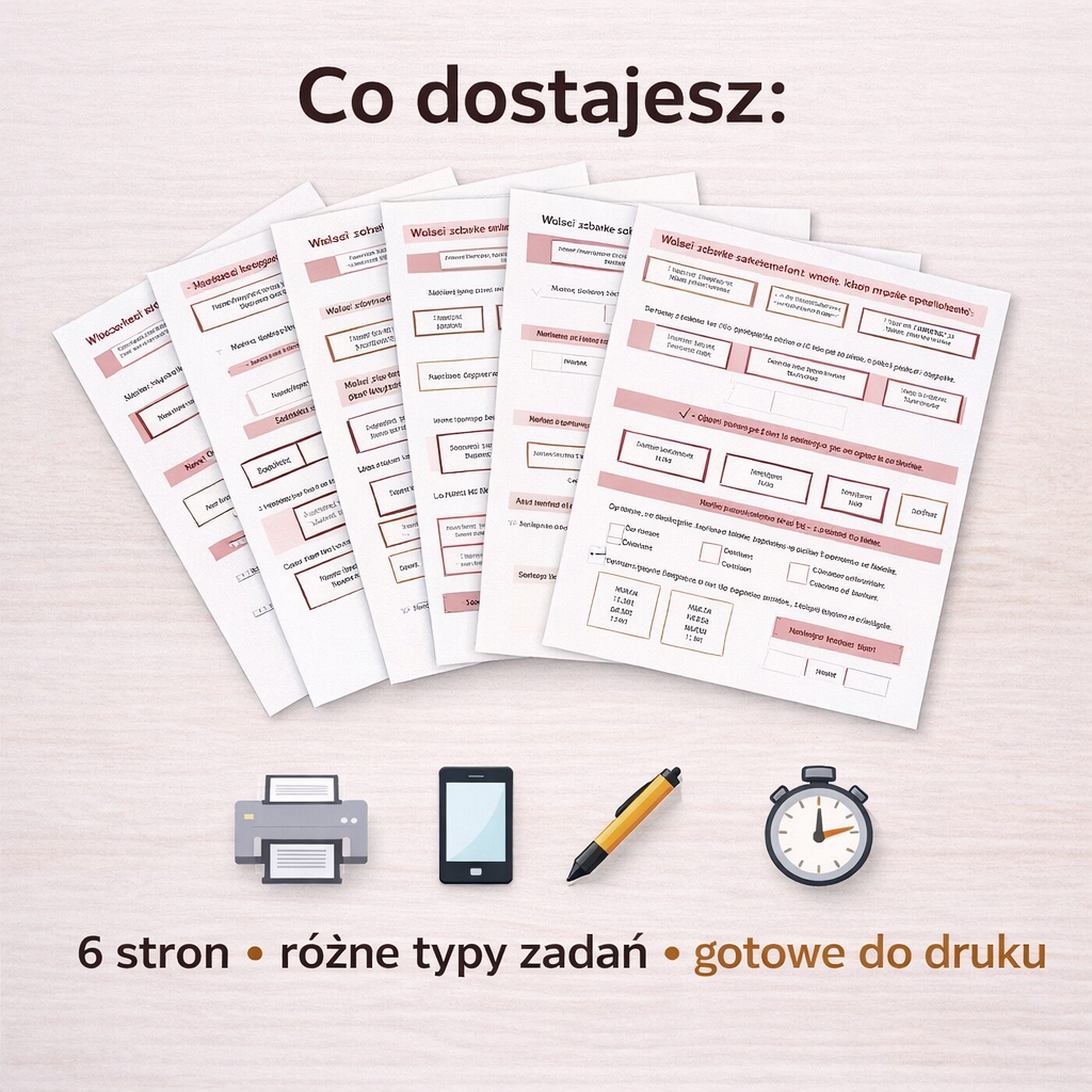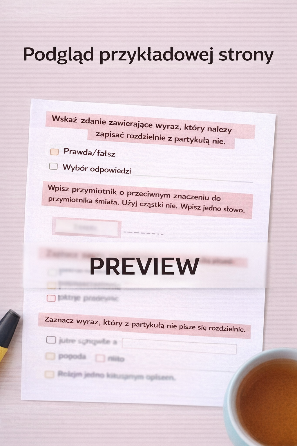 To nie jest sucha teoria. To praktyka, praktyka i jeszcze raz praktyka – w formie różnorodnych zadań, dzięki którym uczniowie ćwiczą uważność, logiczne myślenie i poprawność ortograficzną. A Ty oszczędzasz czas, bo materiał jest gotowy do użycia od razu 💛