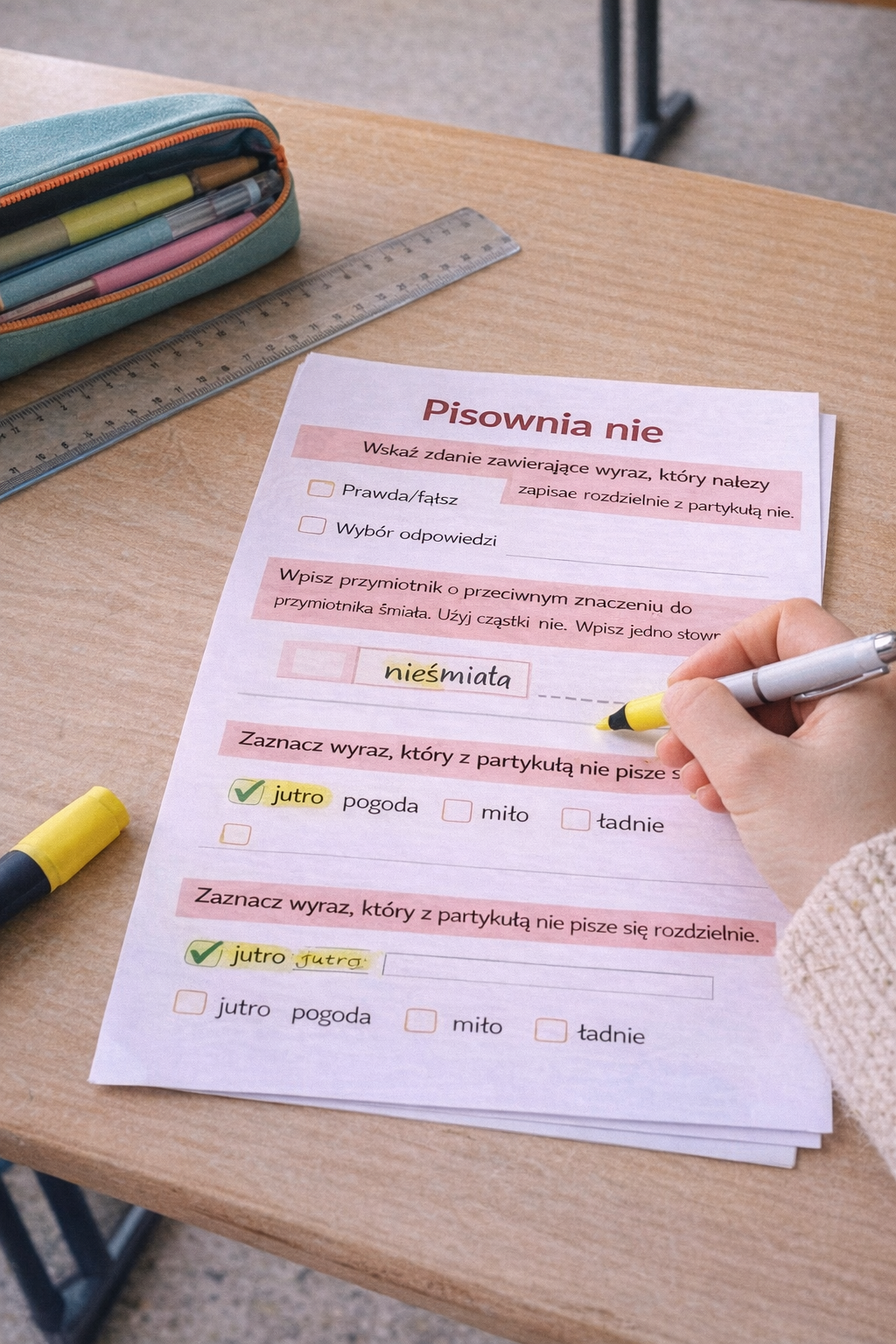 Masz w klasie (albo w domu) wieczne pytanie: „to piszemy razem czy osobno?” 😅 A szczególnie wtedy, gdy w grę wchodzi „nie”? Ten zestaw to szybki, konkretny i jednocześnie angażujący sposób na utrwalenie zasad pisowni „nie” z czasownikami, przymiotnikami, przysłówkami i rzeczownikami – na przykładach, które naprawdę „wchodzą do głowy” ✅📚