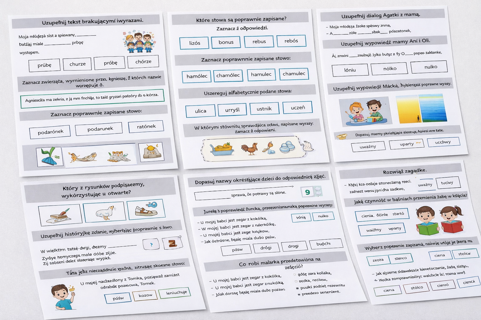 📄 6 stron starannie opracowanych ćwiczeń ortograficznych, obejmujących: