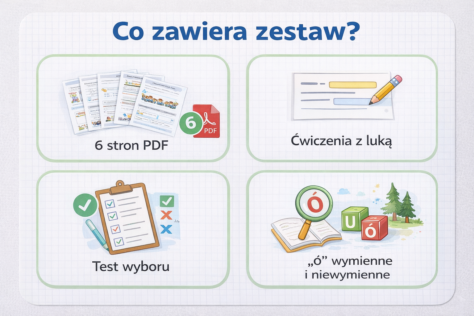 Szukasz gotowego, dopracowanego materiału do nauki ortografii? Chcesz, aby Twoi uczniowie ćwiczyli pisownię „ó” wymiennego i niewymiennego oraz „u” otwartego w sposób angażujący i różnorodny? 🎯