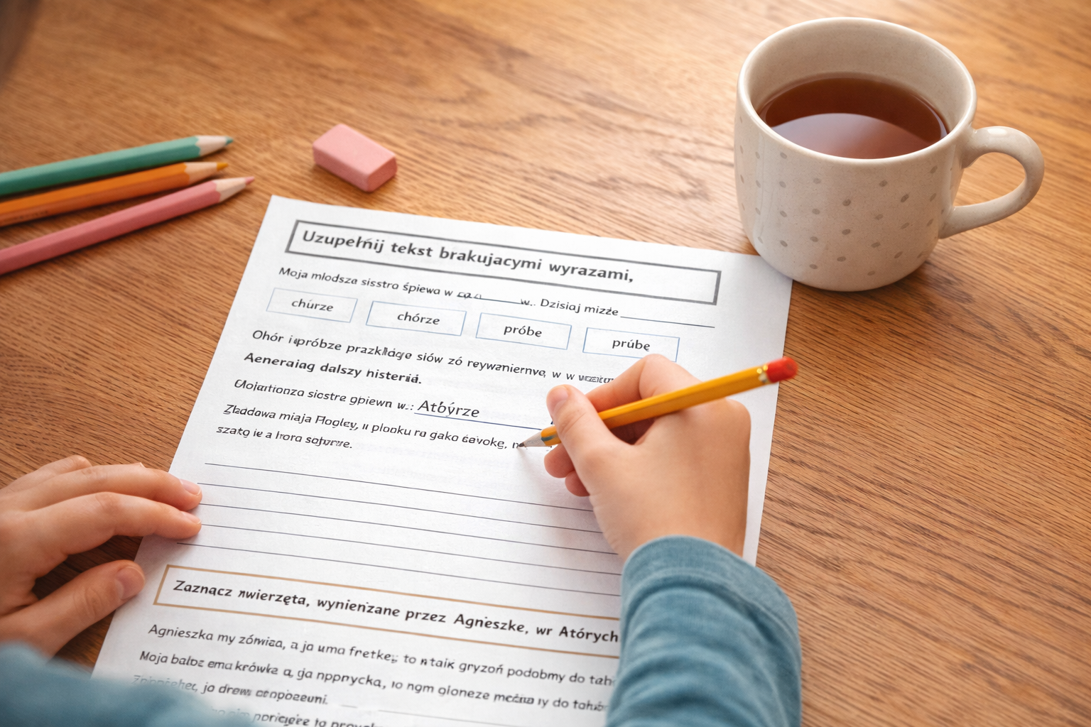 To materiał, który od razu przyciąga uwagę 👀 – dzięki czytelnemu układowi, dużym elementom graficznym i zadaniom, które nie nużą, lecz zachęcają do działania. Dziecko nie tylko wybiera poprawną odpowiedź, ale też uzupełnia zdania, tworzy własne wypowiedzi, porządkuje wyrazy alfabetycznie, rozwiązuje zagadki, pisze krótkie historyjki, układa przepis, odpowiada na pytania i utrwala zasady ortograficzne w praktyce. W materiale pojawiają się m.in. ćwiczenia związane z wyrazami takimi jak chór, próba, żółw, tchórz, racuchy, hamulec, sól, wróżka, ołówek, kukułka, pocałunek, półki i pułki, a także zadania odwołujące się do codziennych skojarzeń, ilustracji i prostych sytuacji bliskich dziecku.