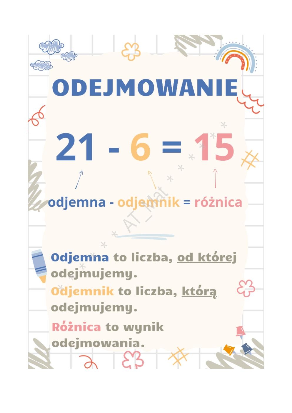 5 plakatów w formacie A4 do samodzielnego wydrukowania. Drukując w mniejszym formacie może być to pomoc dla uczniów (do wklejenia w zeszycie).