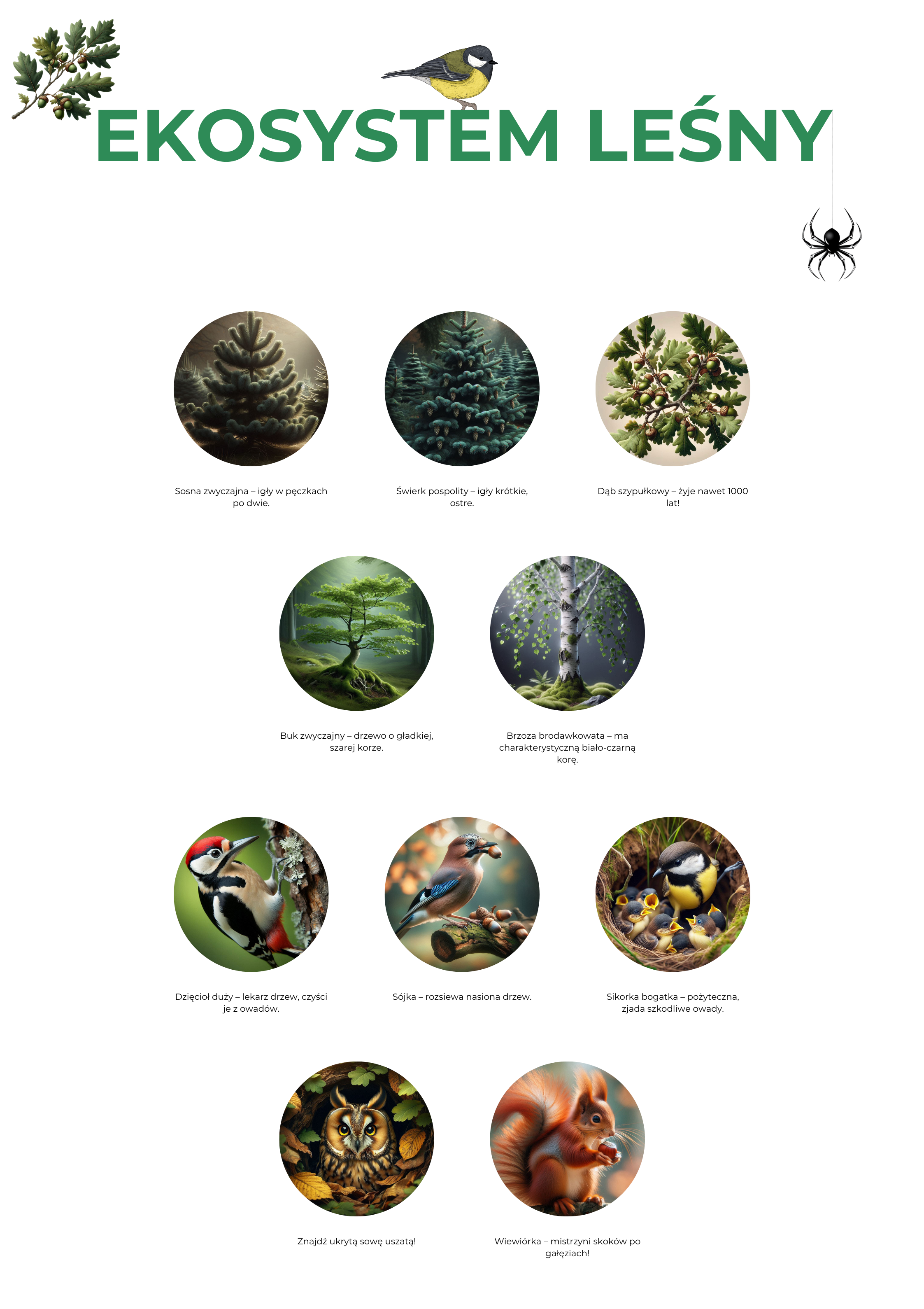 - 🌲 Drzewa naszych lasów – poznaj sosnę zwyczajną, świerk pospolity, dąb szypułkowy, buk zwyczajny oraz brzozę brodawkowatą wraz z ciekawymi faktami o każdym z nich.