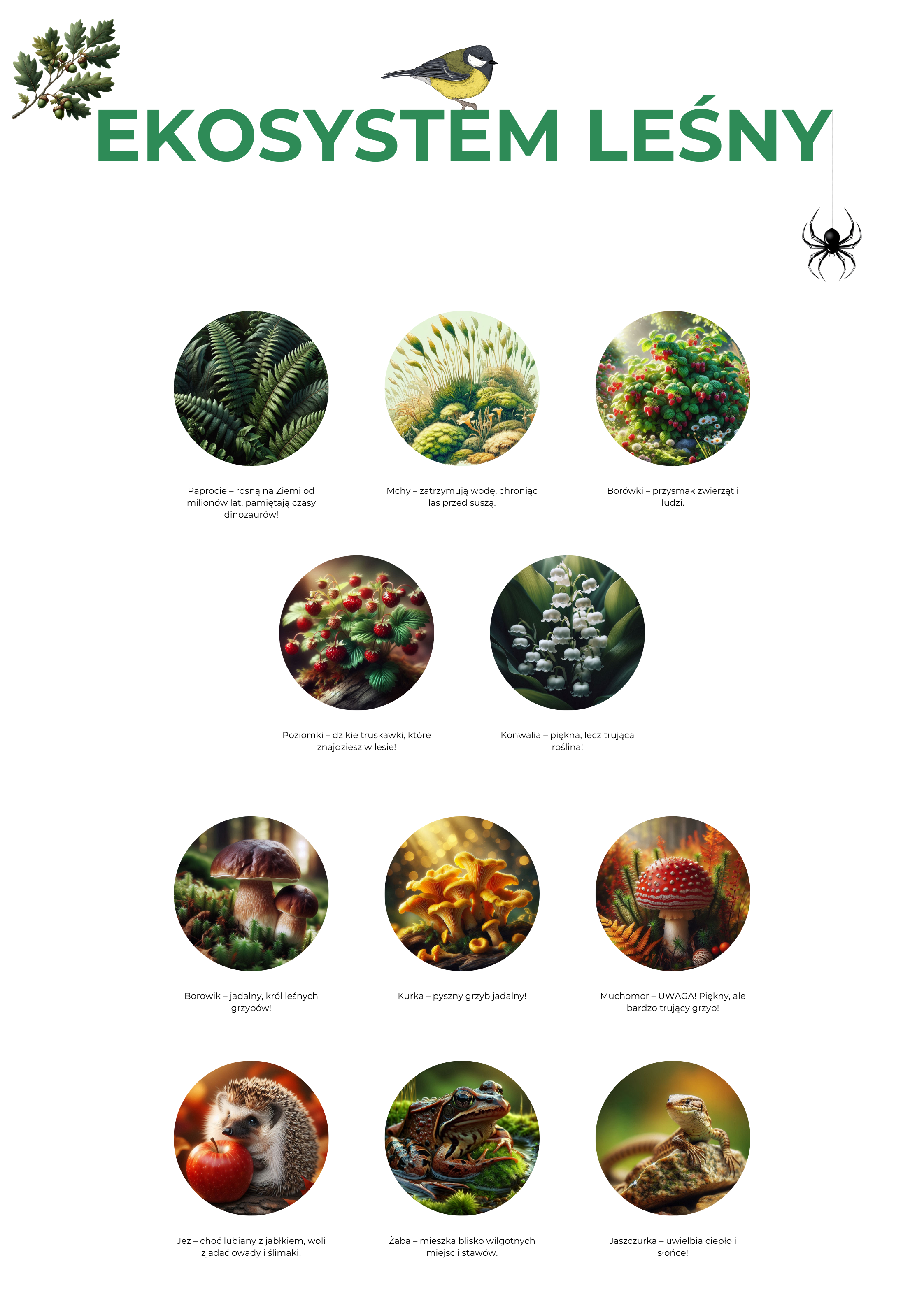 - 🍓 Runo leśne – paprocie pamiętające czasy dinozaurów, miękkie mchy chroniące las przed suszą oraz smakowite borówki i poziomki. Uwaga na piękną, lecz trującą konwalię! 🌱