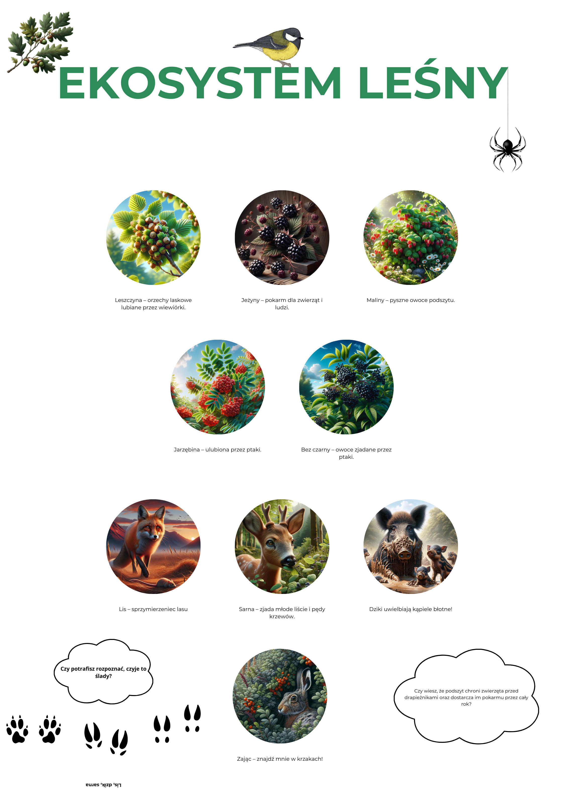 - 🐾 Podszyt leśny – pełen pysznych malin, jeżyn, orzechów laskowych oraz owoców jarzębiny i bzu czarnego. Spotkaj tu sprytnego lisa 🦊, sarnę 🦌, dziki 🐗, które uwielbiają błotne kąpiele, oraz zająca 🐇 (ukrytego w krzakach!).