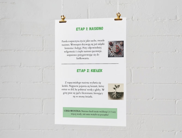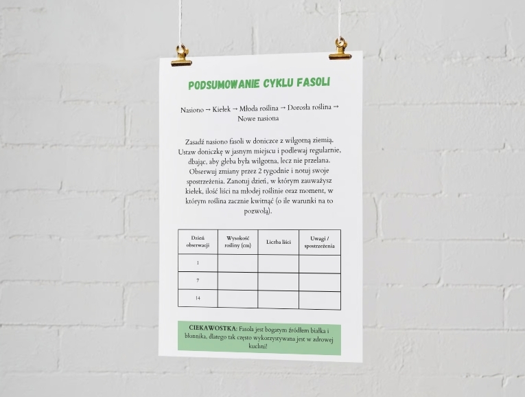 Poznaj fascynujący cykl życia fasoli – od suchego nasionka aż po dorosłą roślinę wydającą nowe strąki! Zestaw ten zawiera przejrzyste ilustracje i zrozumiałe opisy każdego etapu, dzięki czemu świetnie sprawdzi się w szkole lub w domu. Materiał pobudza ciekawość dzieci, zachęca do własnych eksperymentów z hodowlą fasoli oraz uczy szacunku do natury. Idealny dodatek do kącika przyrodniczego lub prezentacji edukacyjnej.