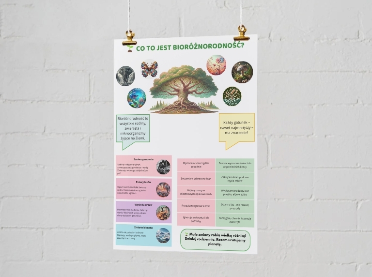 🌿 Plakat "Bioróżnorodność" – tłumaczy, czym jest różnorodność biologiczna i dlaczego każdy gatunek – nawet ten najmniejszy – ma znaczenie. Idealny do rozmowy o roli pszczół, drzew i wpływie człowieka na środowisko.