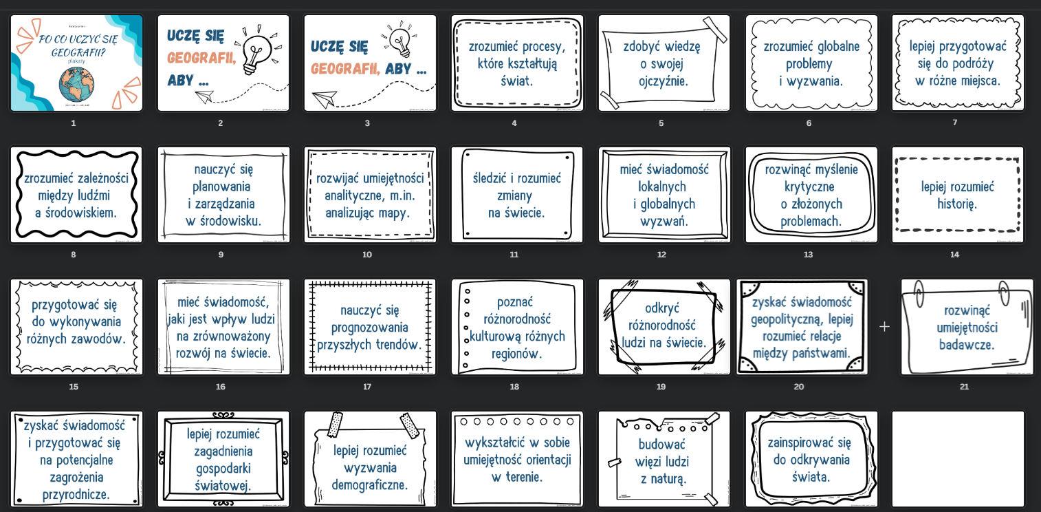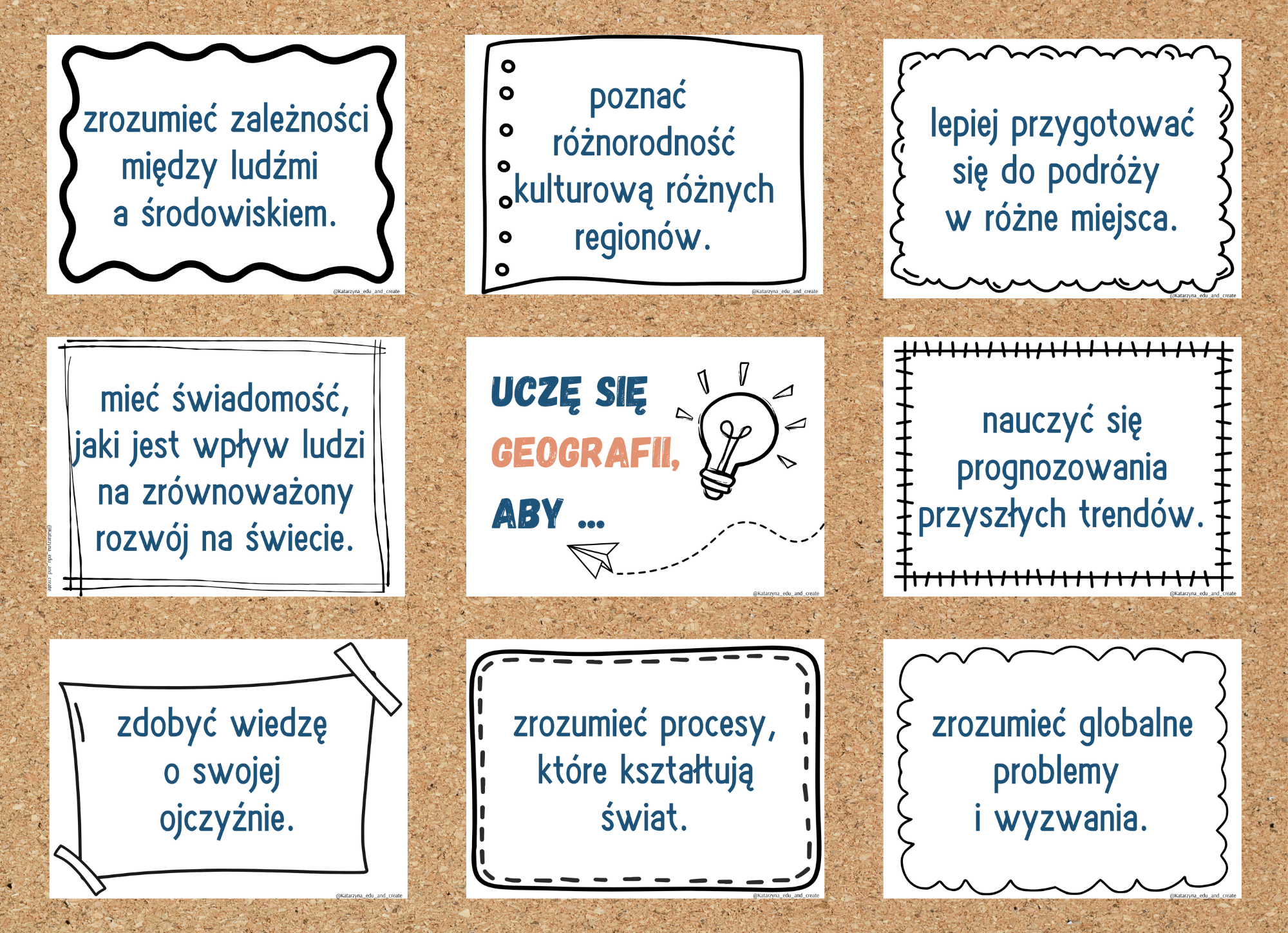 25 plakatów z odpowiedziami na pytanie: "Po co sie uczyć geografii?". Możesz wykorzystać wydrukowane i zalaminowane plakaty jako dekoracja sali.