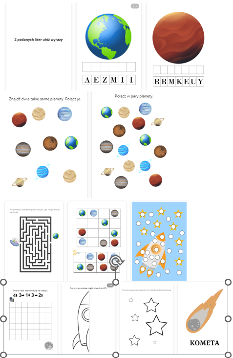 PLANETY - KARTY PRACY rozsypanka literowa, kolorowanki sudoku wyklejanie, puzzle, kolorowanki, labirynt, kosmos