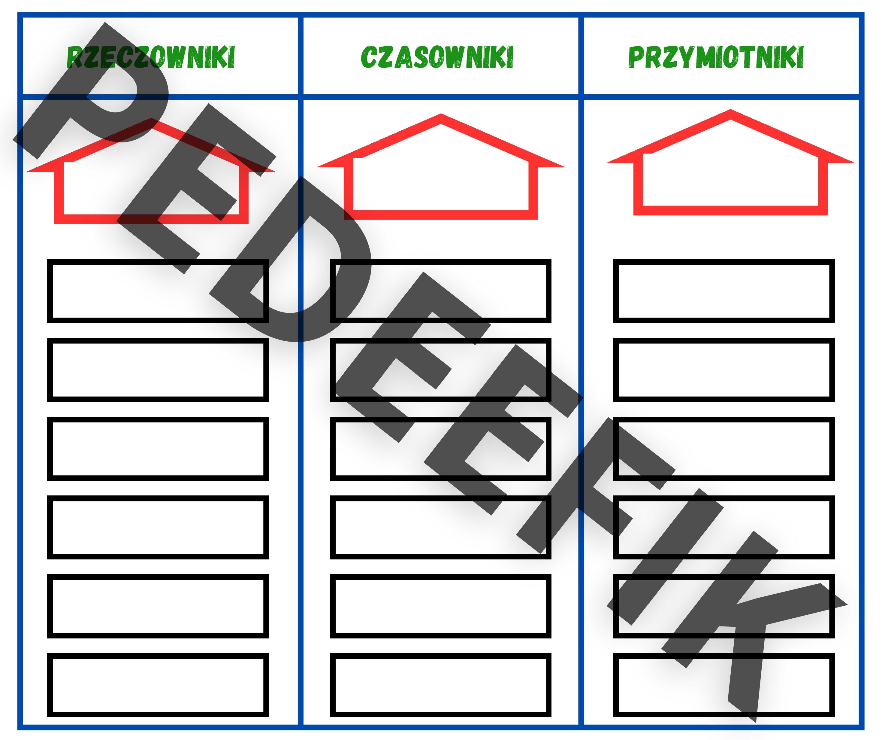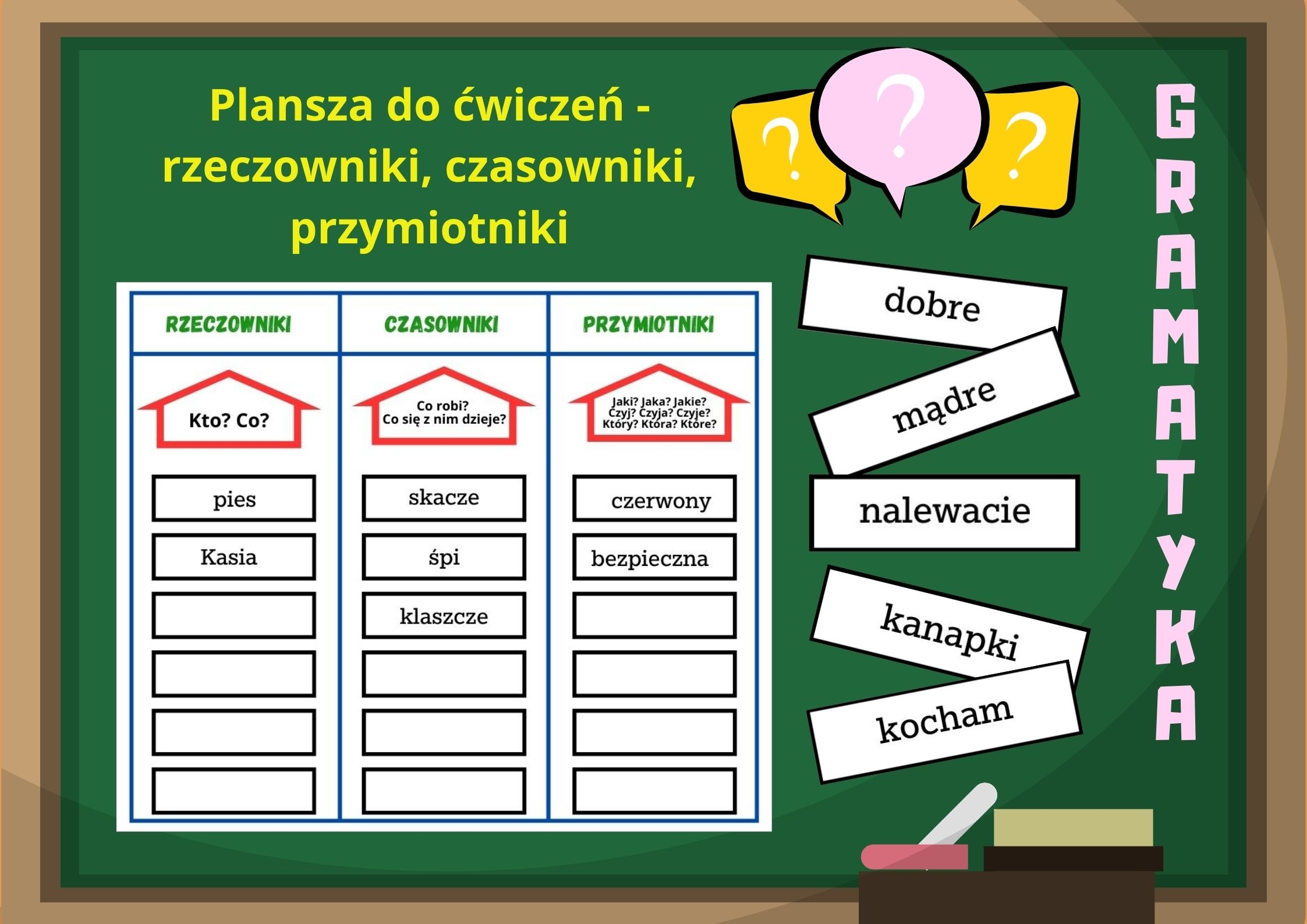Plansza do ćwiczeń rzeczowników, czasowników i przymiotników.