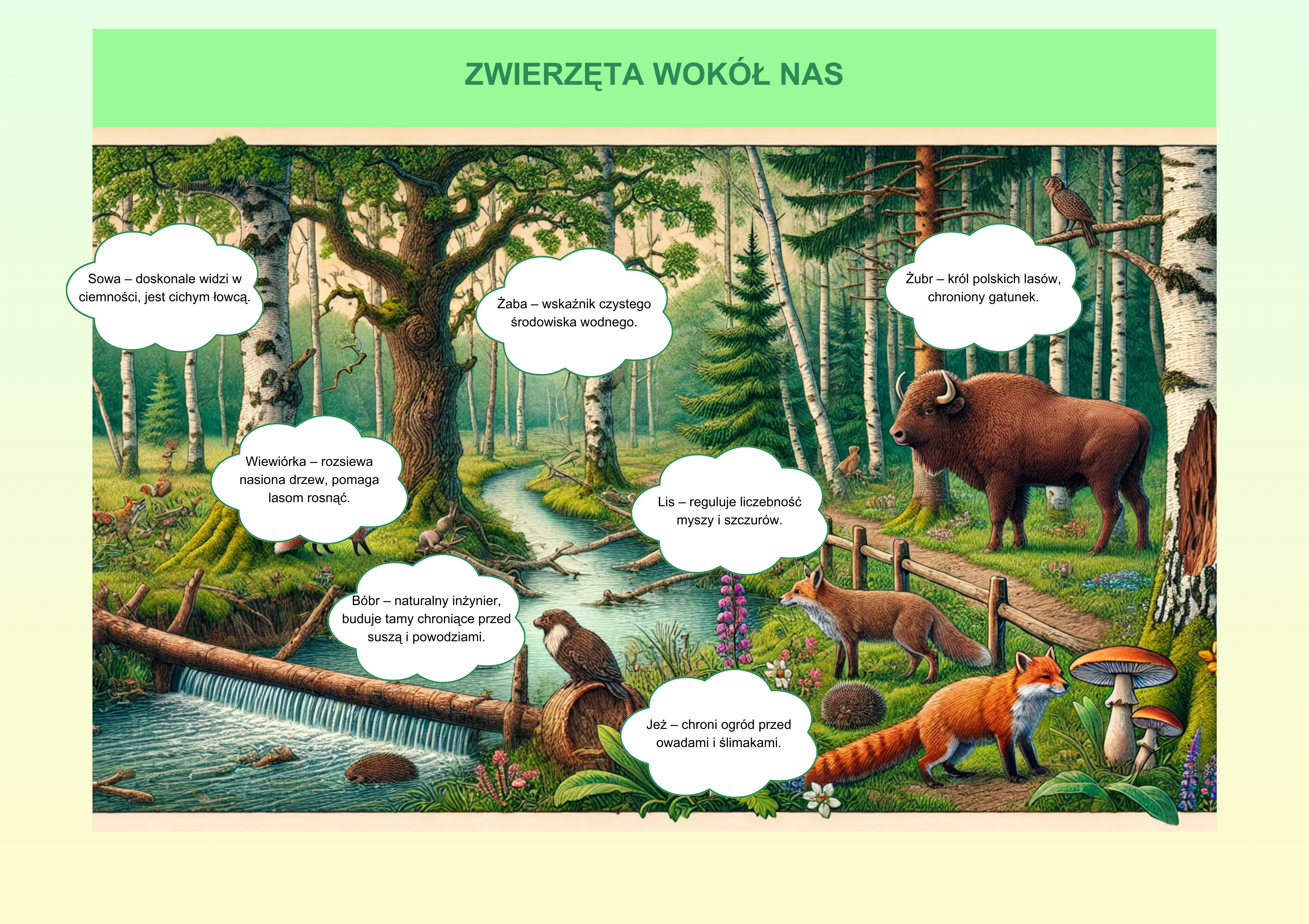 Dowiedz się, dlaczego żubr jest królem lasów 🌲, jak bóbr pomaga ekosystemowi 💧, i dlaczego jeż jest przyjacielem ogrodów. Odkryj ciekawostki o sowach 🦉, lisach 🦊 i wiewiórkach! 🐿️