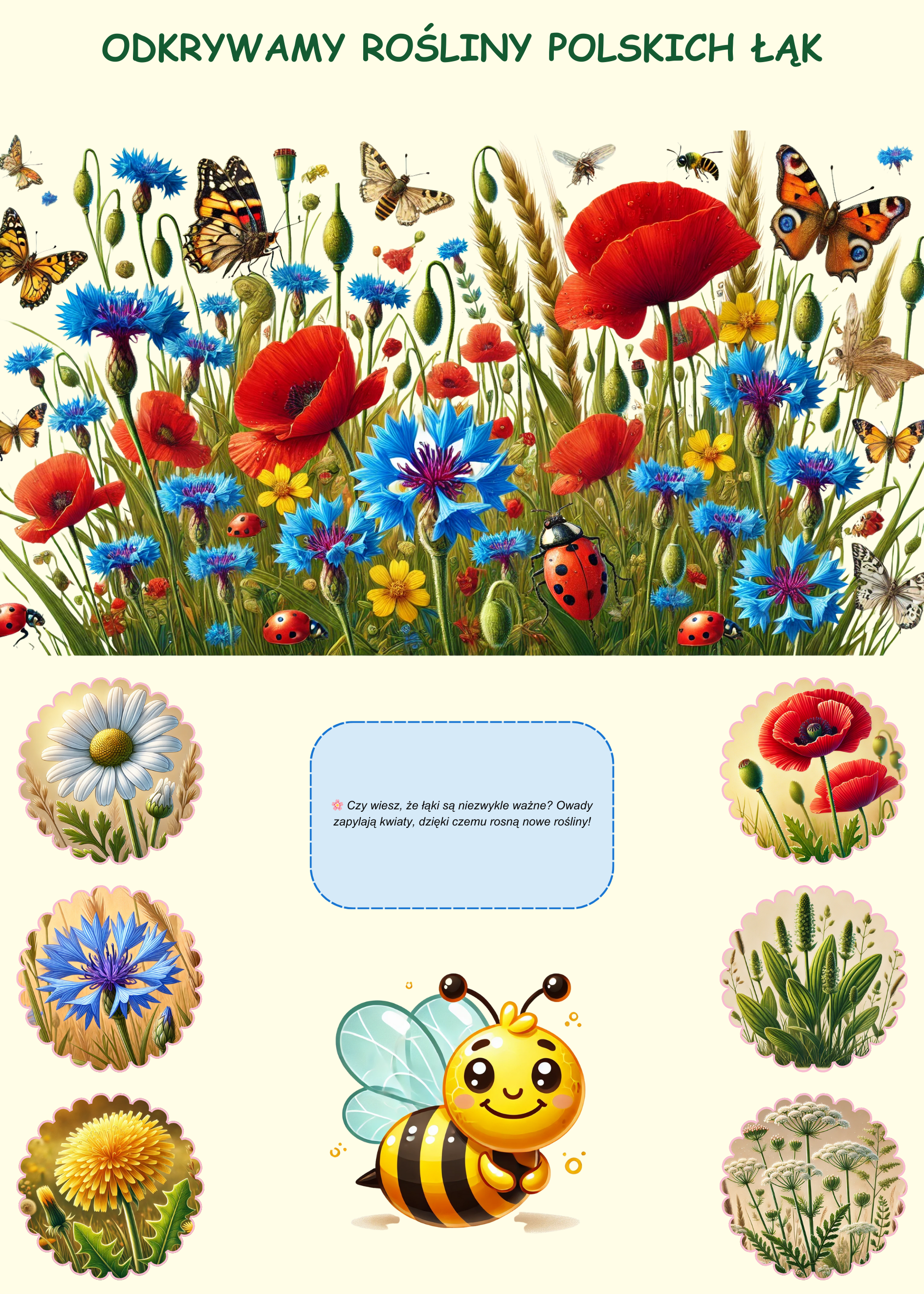 🌼 Rośliny polskich łąk – sprawdzisz, jak ważne są łąki dla całego ekosystemu, nauczysz się rozpoznawać rośliny oraz poznasz ich niezwykłe zastosowania! 🌱🐝