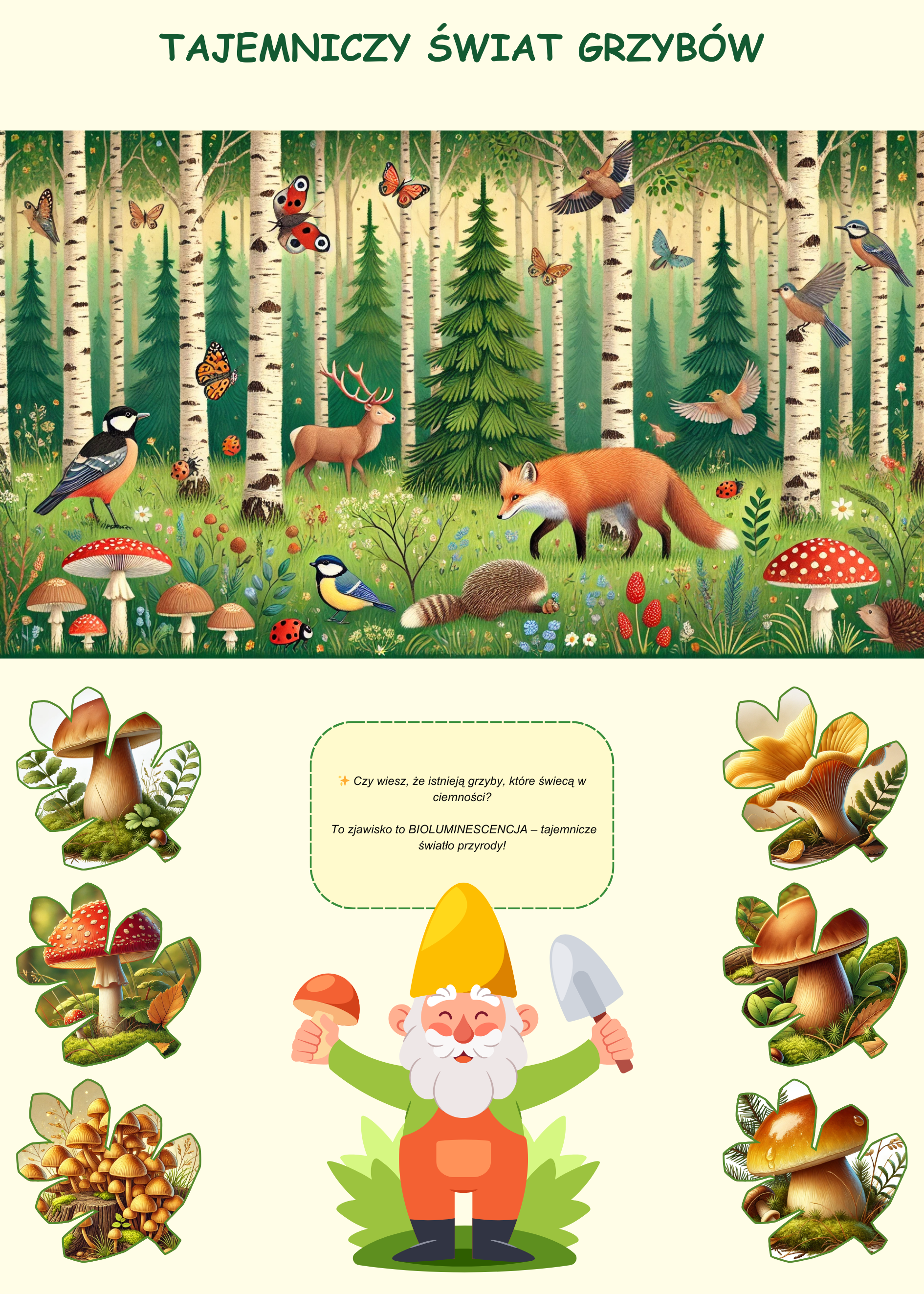 🍄 Tajemniczy świat grzybów – dowiesz się, które grzyby są jadalne, a które trujące! Nauczysz się czym jest bioluminescencja, czyli tajemnicze świecenie organizmów w ciemności! 🌟