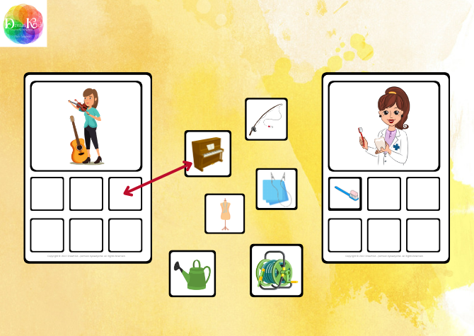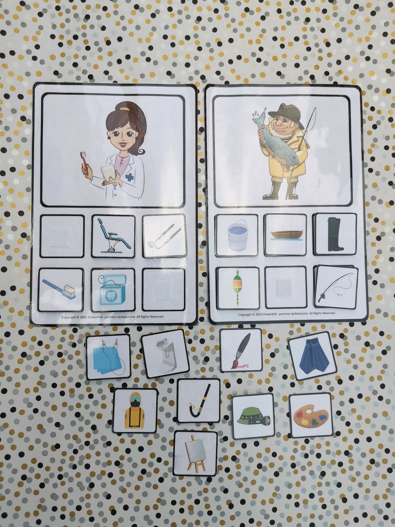 Plansze do uzupełnienia Zawody - Atrybuty. Zestaw przedstawia aż 16 zawodów na planszach o wymiarach: 18 cm x 24 cm oraz 96 kartoników atrybutów do uzupełnienia. Dzięki tym kartom dzieci w przyjemny sposób zapoznają się z tematyką "zawodów".