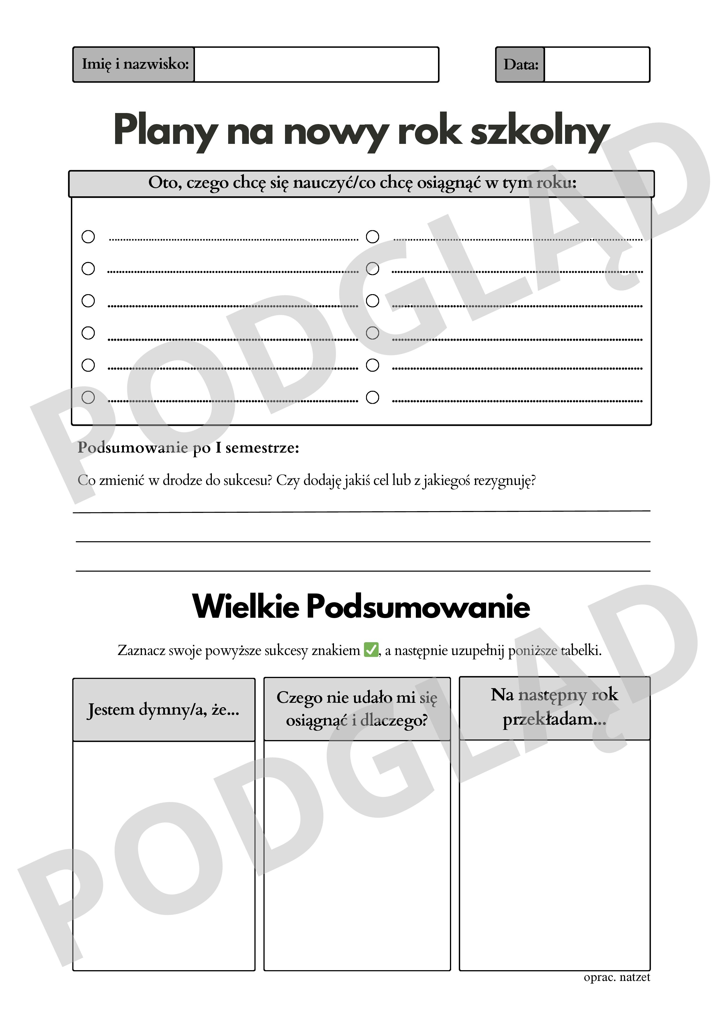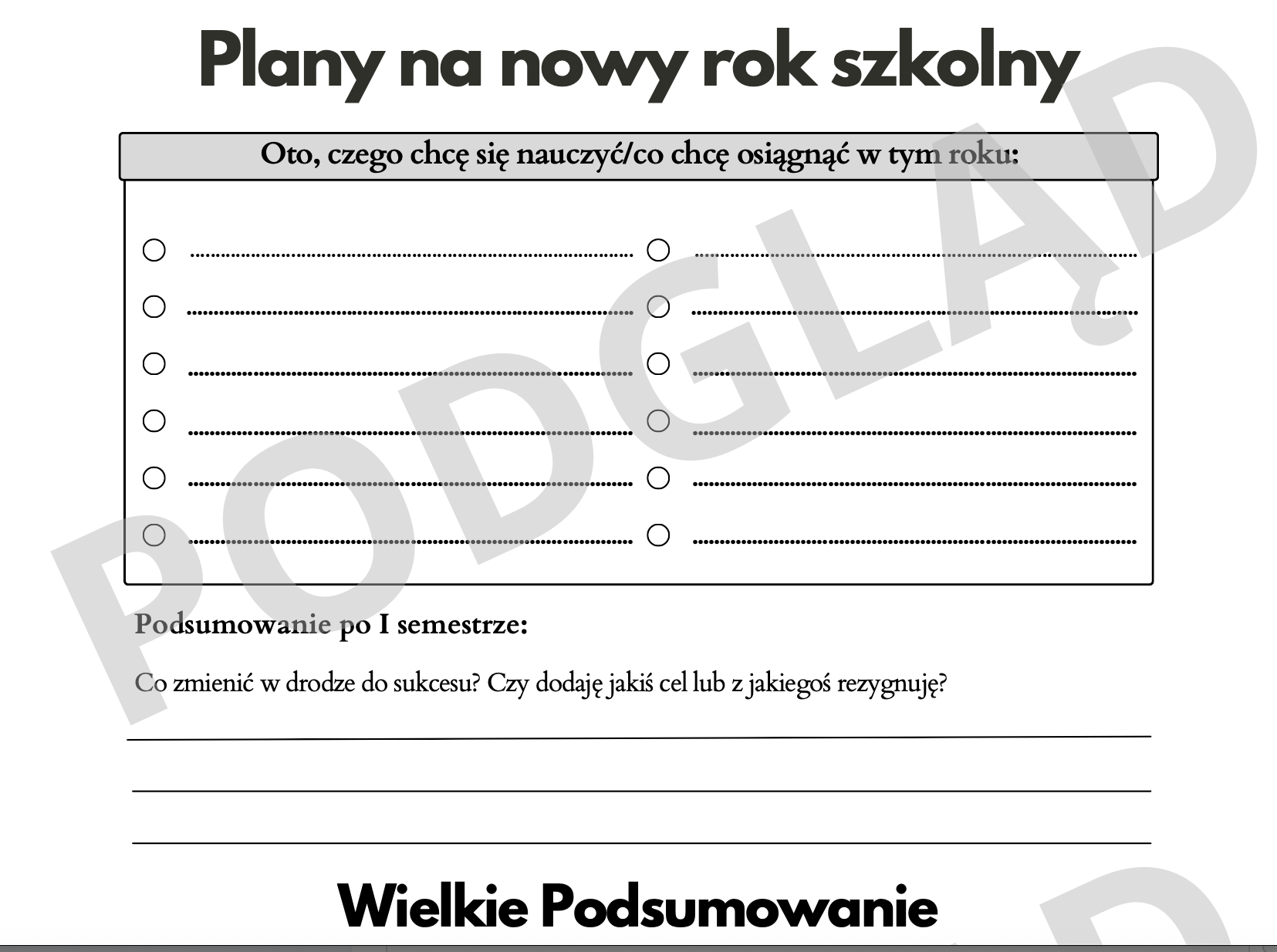 Twoi uczniowie chcą nauczyć się porządnie części mowy? Zostać przewodniczącym szkoły? Może wygrać zawody lekkoatletyczne lub zająć czołowe miejsce w konkursie plastycznym? Wszystkie cele wymagają odpowiedniego planu. Karta pracy ,,Plany na nowy rok szkolny" to pomysł do wykorzystania na lekcję wychowawczą lub zajęcia przedmiotowe, na których uczniowie wyznaczają sobie konkretne cele związane z daną dziedziną. Materiał powstał z myślą, by nie tylko zaplanować nowy rok szkolny, ale także dokonać ewaluacji po pierwszym oraz drugim semestrze.
