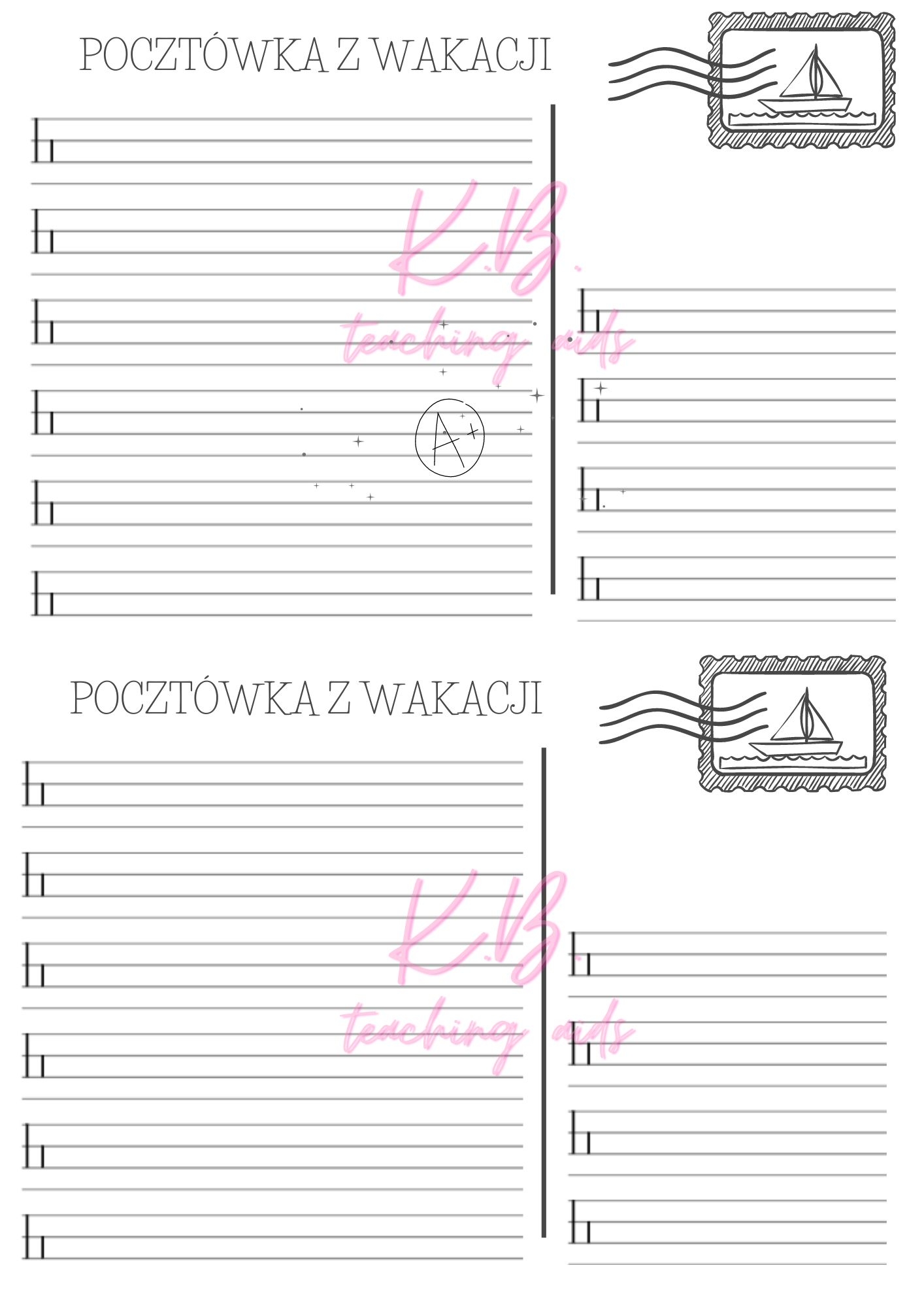 Pocztówka z wakacji dla uczniów klasy 2,3 sp. Dziecko pisze pozdrowienia z wakacji, na odwrocie rysuje swoje wakacyjne wspomnienie.