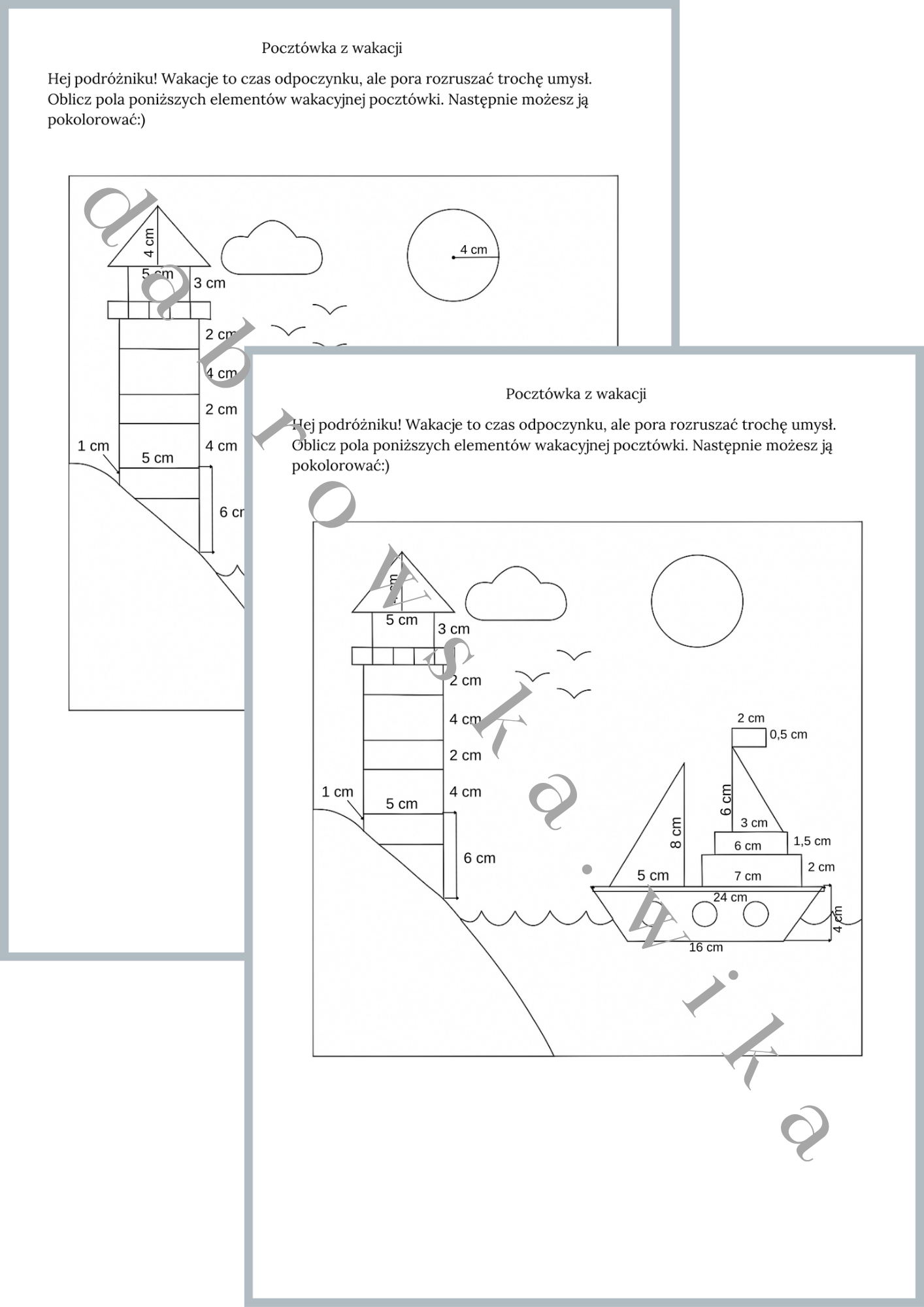 Materiał zawiera kartę pracy „Pocztówka z wakacji”, w której uczniowie rozwiązują zadania geometryczne, obliczając pola różnych figur przedstawionych na wakacyjnej ilustracji z latarnią morską, statkiem, chmurkami i słońcem.