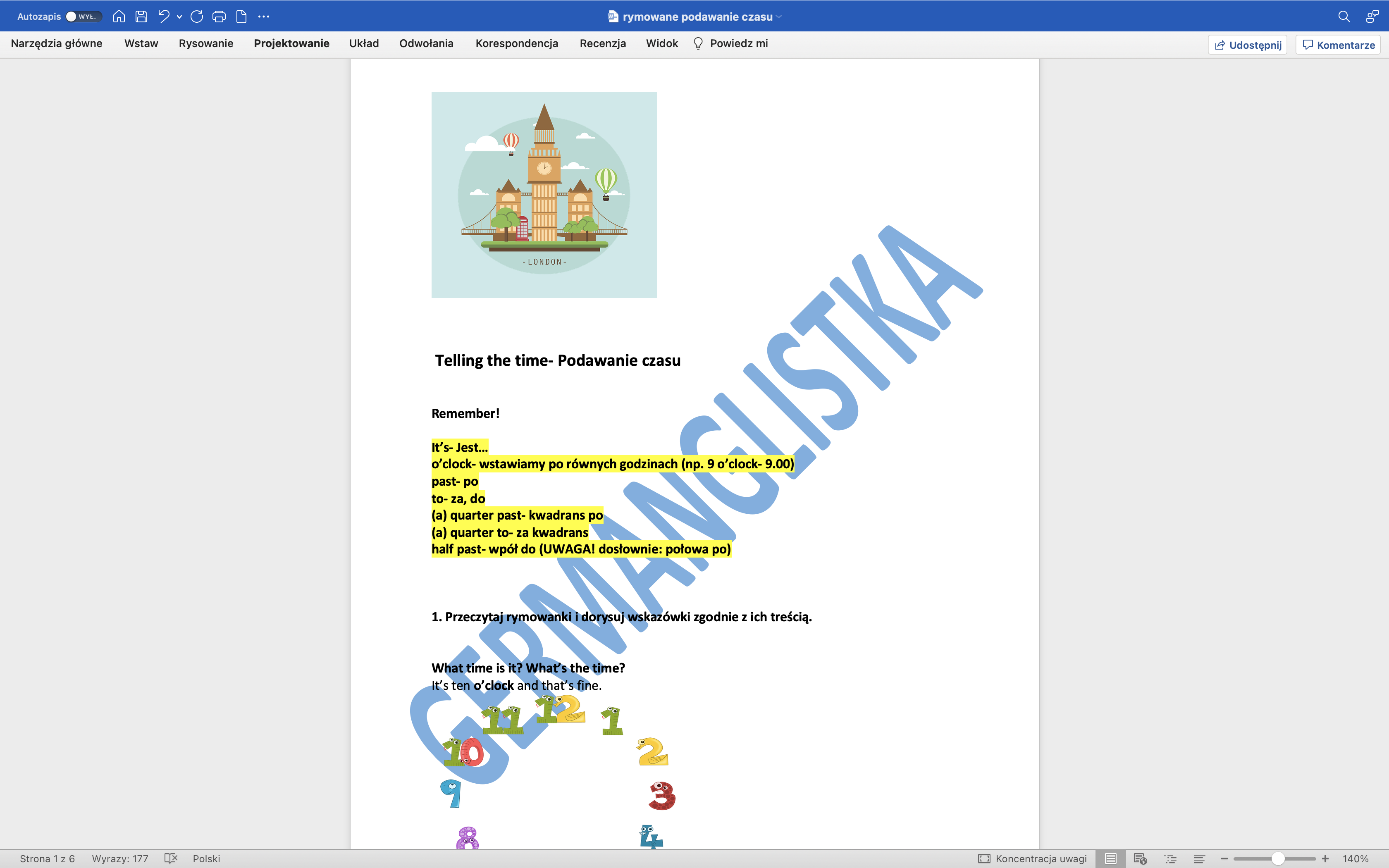 Podawanie czasu w j. angielskim- rymowanka i ćwiczenia- 6 stron