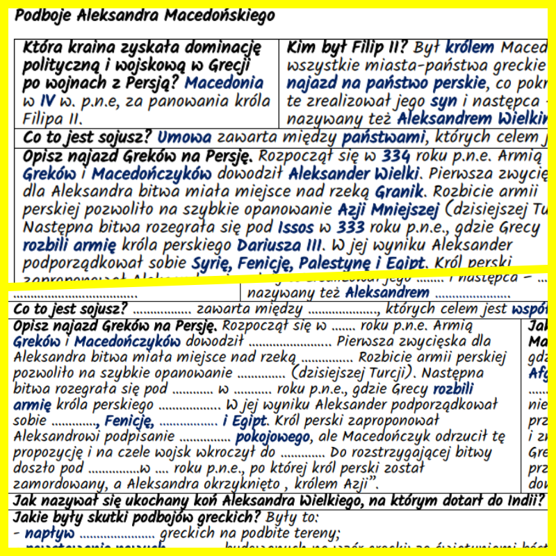 Notatki w formie pytań i odpowiedzi stanowiące bazę wiedzy o podbojach Aleksandra Macedońskiego, przygotowane dla klasy 5 według podstawy programowej nauczania historii w szkole podstawowej (Podstawa programowa – Historia – Szkoła podstawowa IV-VIII) oraz utrwalająca wiedzę karta pracy zawierająca luki w treści wymagające uzupełnienia ustnego lub pisemnego.