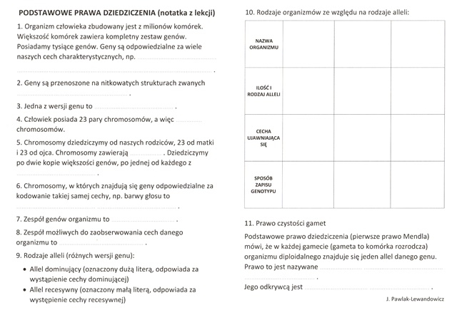 Podstawowe prawa dziedziczenia - karta pracy do uzupełnienia podczas zajęć.