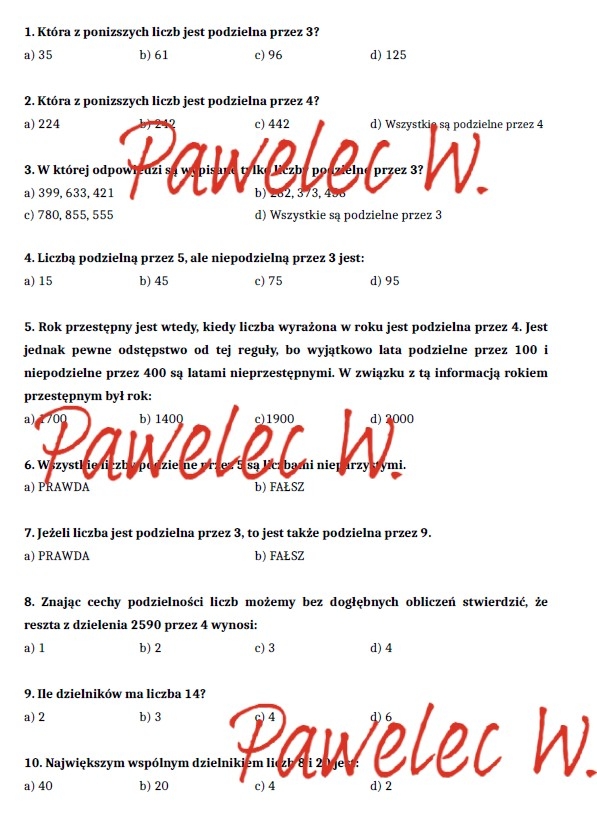 Test sprawdzający wiedzę o podzielności liczb.