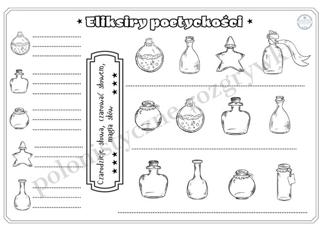 Dzięki karcie pracy "Poetyckie eliksiry" uczniowie poznają i utrwalają środki artystyczne w nietuzinkowy sposób. Metafora - czerwony, epitet - żółty, archaizm - granatowy? Fikuśne buteleczki? Dlaczego nie! Przecież poeci i pisarze to "czarodzieje słowa" , natomiast w kontekście bogactwa środków poetyckich często mówimy o "magii słowa". Notatka umożliwia stworzenie kolorowej legendy zaznaczania środków stylistycznych w tekstach literackich. Wyróżniono kilka magicznych buteleczek do zapisania definicji środków sprawiających największe trudności w rozpoznawaniu. Przyda się w szczególności podczas przygotowań do egzaminu ósmoklasisty, ale młodsi też na pewno skorzystają.