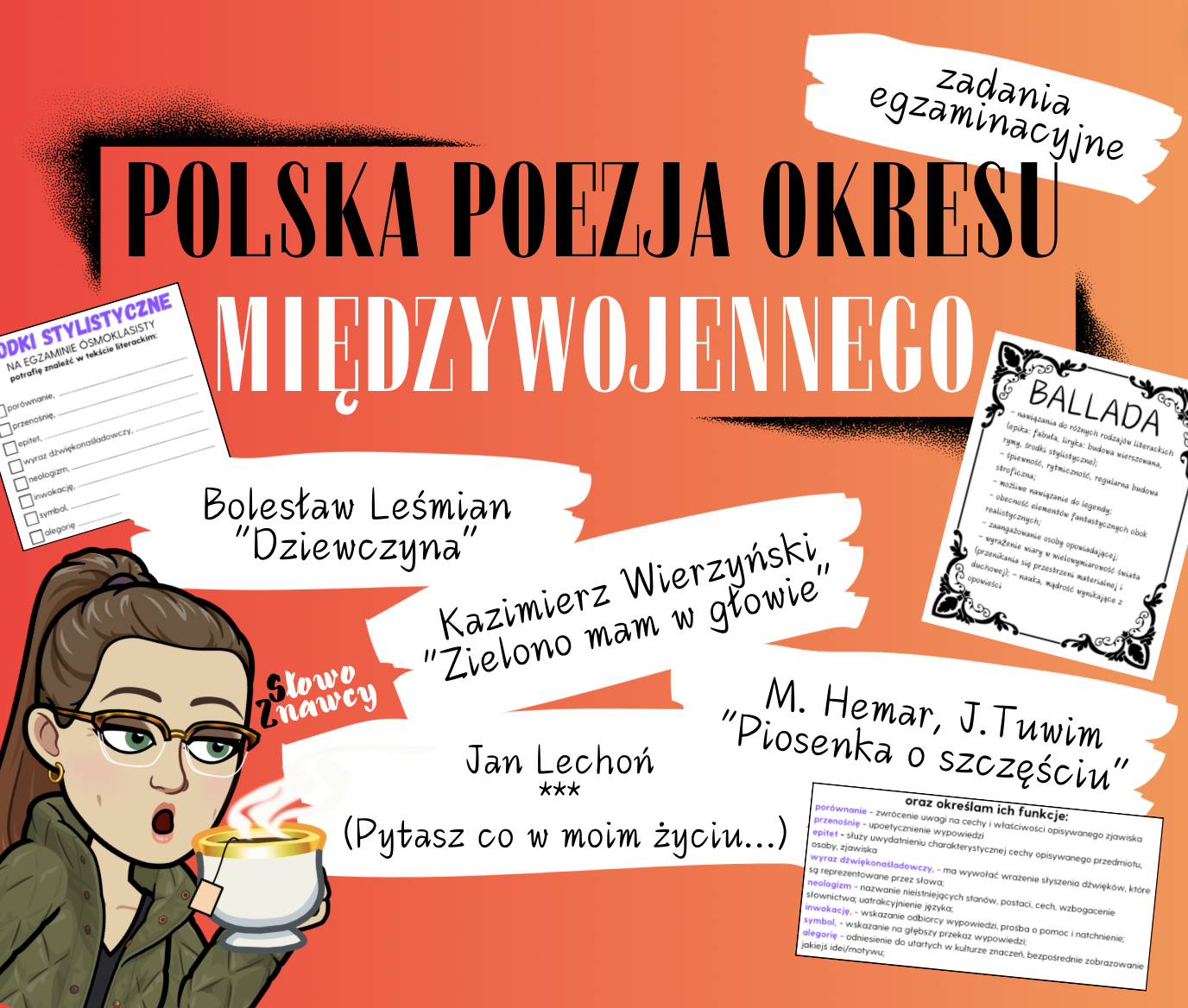 Wklejka o balladzie dla uczniów oraz karta pracy i notatka o środkach stylistycznych na egzaminie ósmoklasisty w 2024 roku.