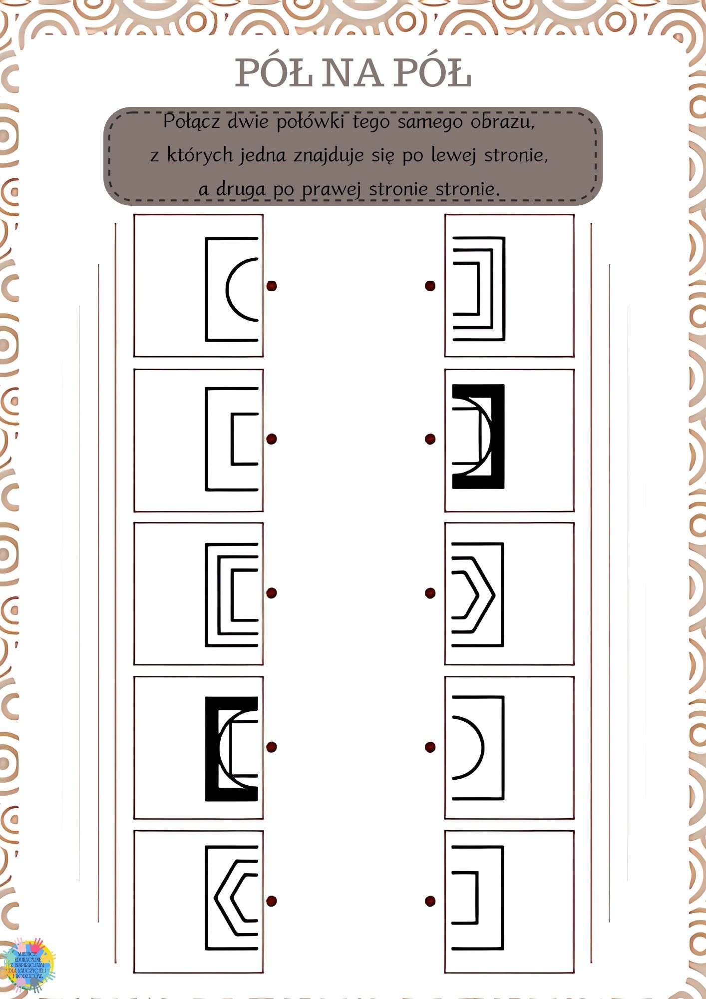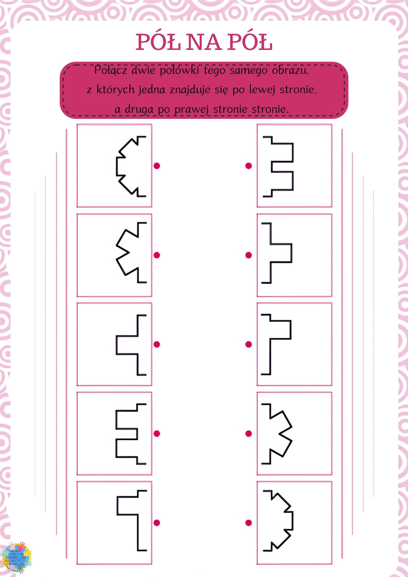 a także pobudzą umysł do niestandardowego myślenia. W każdym zadaniu dziecko musi obejrzeć dwie połowy różnych rysunków po lewej stronie i dopasować odpowiednie połówki po prawej stronie, łącząc je linią. Ćwiczenia pomogą poprawić skupienie i rozwijać umiejętności porównywania, analizy, syntezy