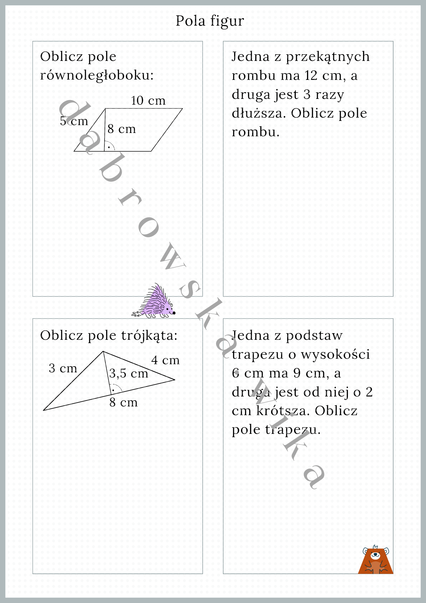 Materiał zawiera kartę pracy podsumowującą obliczanie pól figur takich jak: pola trapezu, trójkąta, równoległoboku, rombu oraz prostokąta i kwadratu. To wszystko znajduje się w tym materiale.