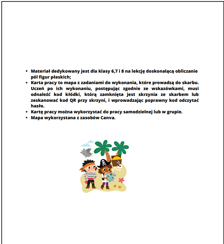 Karta pracy to mapa z zadaniami do wykonania, które prowadzą do skarbu. Uczeń po ich wykonaniu, postępując zgodnie ze wskazówkami, musi odnaleźć kod kłódki, którą zamknięta jest skrzynia ze skarbem lub zeskanować kod QR przy skrzyni, i wprowadzając poprawny kod odczytać hasło.