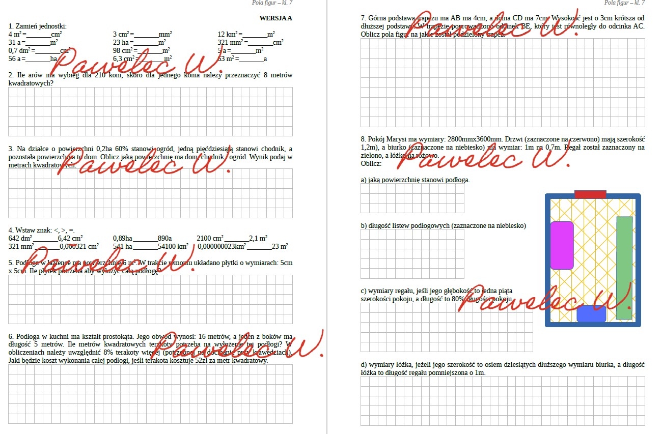 POLA FIGUR, zamiana jednostek - karta pracy, sprawdzian - kl. 7, dwie grupy/wersje + odpowiedzi