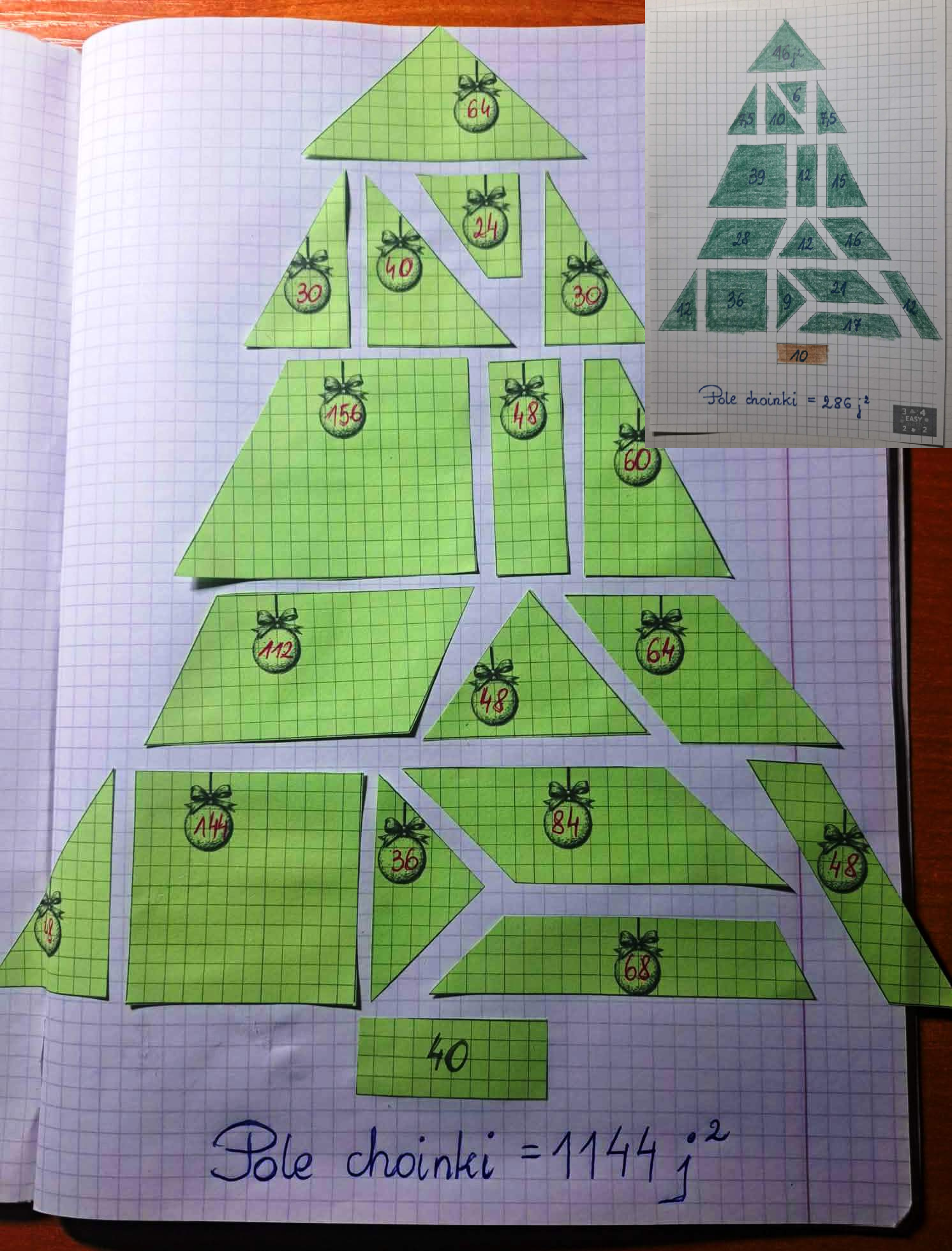 - mniejsza - choinkę w całości można wydrukować na jednej stronie. Każdy uczeń otrzymuje swoją choinkę, oblicza pola poszczególnych figur i całej choinki, koloruje ją i ozdabia.