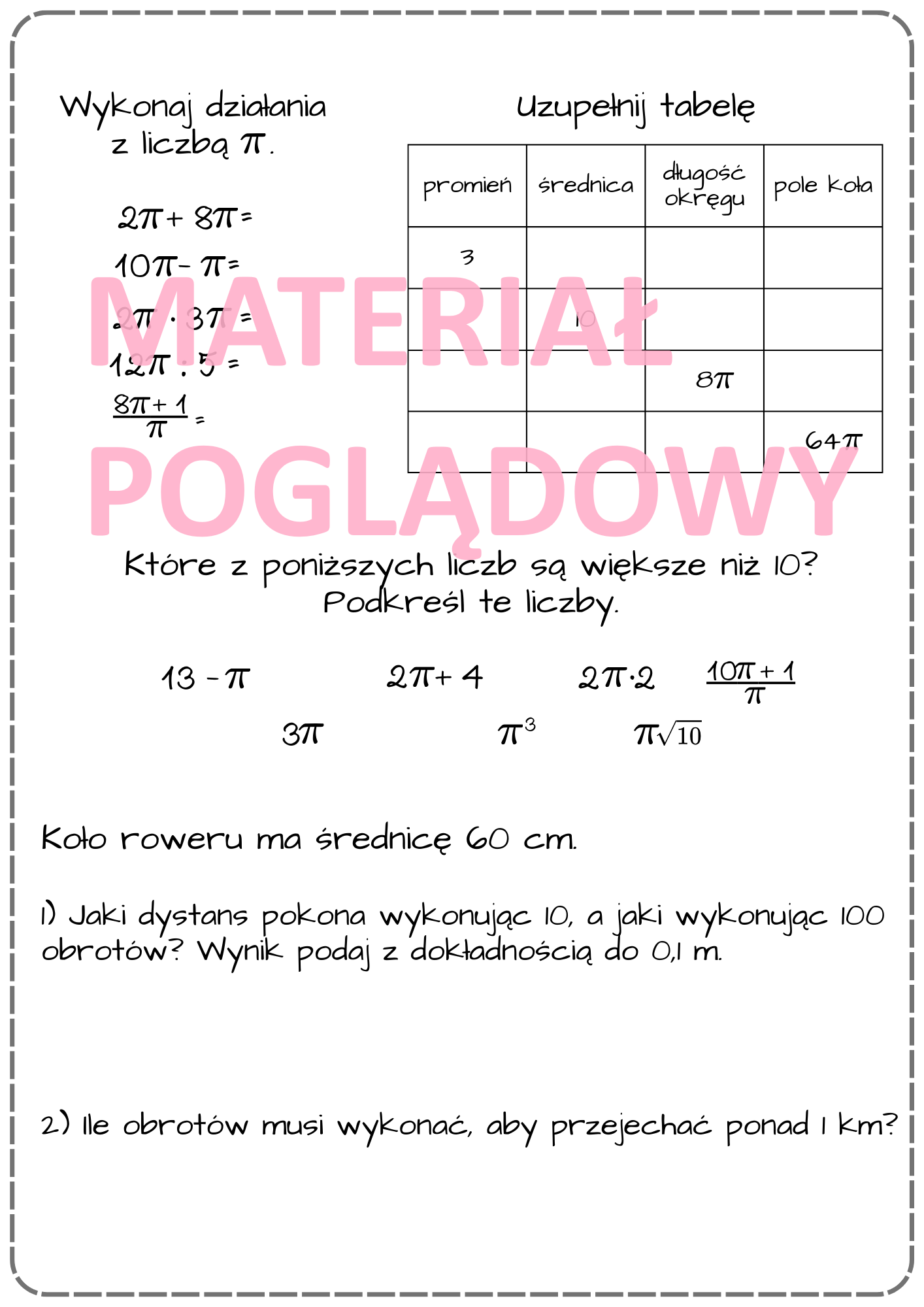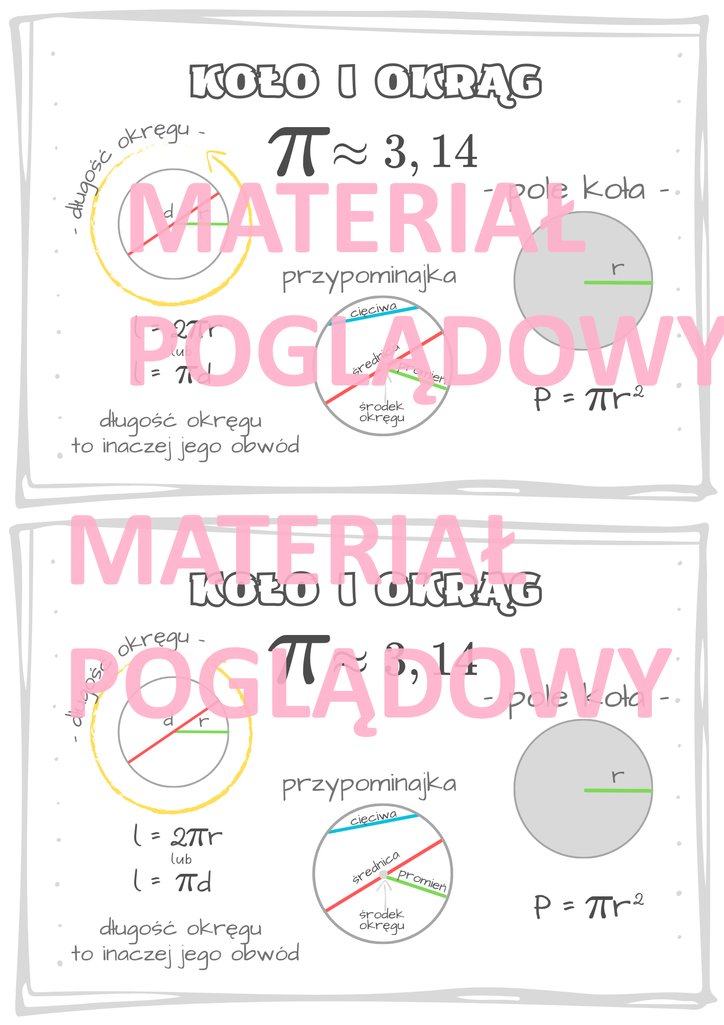 - notatka/ plansza dotyczącą obliczania pola koła oraz długości okręgu