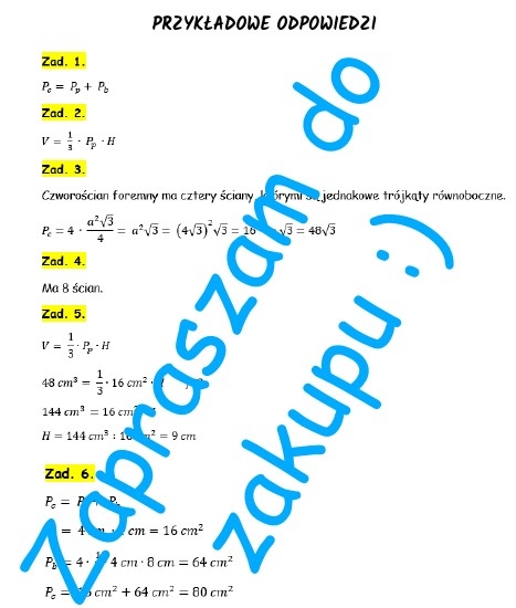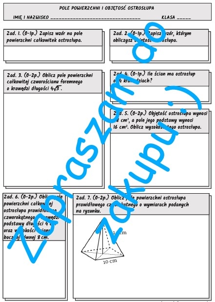 Pole powierzchni i objętość ostrosłupa - kartkówka, karta pracy