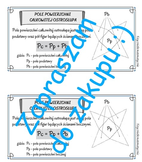 Materiał zawiera wymagany podstawą programową wzór na ple powierzchni całkowitej ostrosłupa. Na stronie formatu A4 znajdują się dwie wklejki do wydruku dla uczniów.