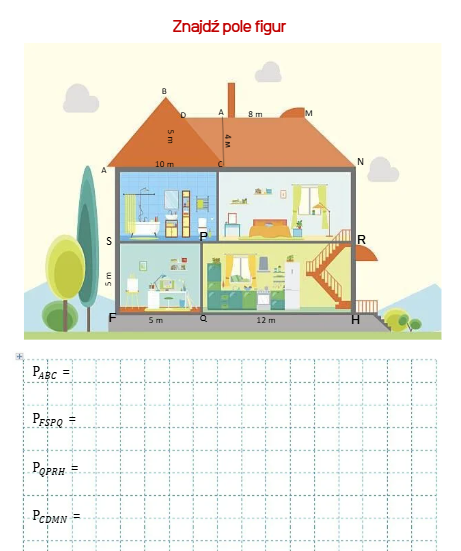 Rozbudowany zestaw kart pracy z matematyki dotyczący pola wielokątów. Materiał przeznaczony do pracy na lekcji, zajęciach wyrównawczych, kółku matematycznym lub jako praca domowa.