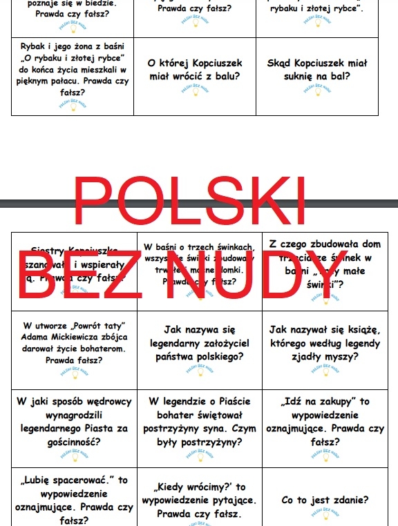 200 kart z wiedzy polonistycznej do gry inspirowanej grą "5 sekund". Taka forma utrwalania/powtarzania/systematyzowania wiedzy jest dla uczniów niezwykle atrakcyjna. Są zaangażowani, skoncentrowani i uczą się bawiąc. Na kartach wiedza z zakresu literatury, teorii literatury, gramatyki, ortografii, słownictwa, form wypowiedzi... :). Zasady gry w pliku!