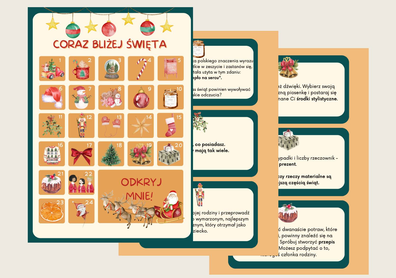 W mojej polonistycznej głowie odliczanie do Bożego Narodzenia jest bardzo istotnym i magicznym czasem. Nie da się ukryć, że tak samo jest dla moich uczniów, którzy wręcz przebierają nogami w odliczaniu do świąt. Już od pierwszego grudnia zaczynają się prośby o świąteczne piosenki, rozmowy, zabawy. A przecież... To istotne, żeby właśnie język polski był miejscem do takich rozmów, które są ważne i poruszają bliską dla dzieci tematykę. Magiczną tematykę!!! Zróbmy to po mojemu! Zróbmy to polonistycznie! Polonistyczny kalendarz adwentowy to propozycja świątecznych zadań połączonych z językiem polskim. To zadania redakcyjne. Internetowe śledztwa. Odrobina gramatyki. Dużo rozmów. Uwrażliwiania. Kręcenia się wokół dobroci dla innych. Plik zawiera karty do kalendarza x2. Jedna wersja narzuca kolejność rozwiązywania kart, druga pozostawia Wam dowolność (bez narzuconych grafik odpowiadających grafikom z kalendarza).