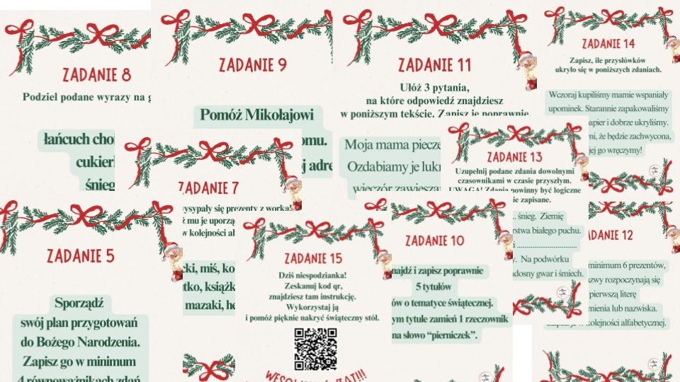 Kalendarz liczy 15 zadań – po 1 na każdy dzień. Są to ćwiczenia sprawdzające umiejętności gramatyczno-ortograficzne: znajomość alfabetu, zasad ortografii i interpunkcji, używania czasowników, rzeczowników, przymiotników, przysłówków, równoważników zdań, dzielenia wyrazów na głoski, zapisywania adresu, układania pytań itp. Są to zadania, z którymi mogą sobie poradzić już uczniowie klasy 4. Dla tych starszych może to być doskonała forma powtórzenia wiadomości.