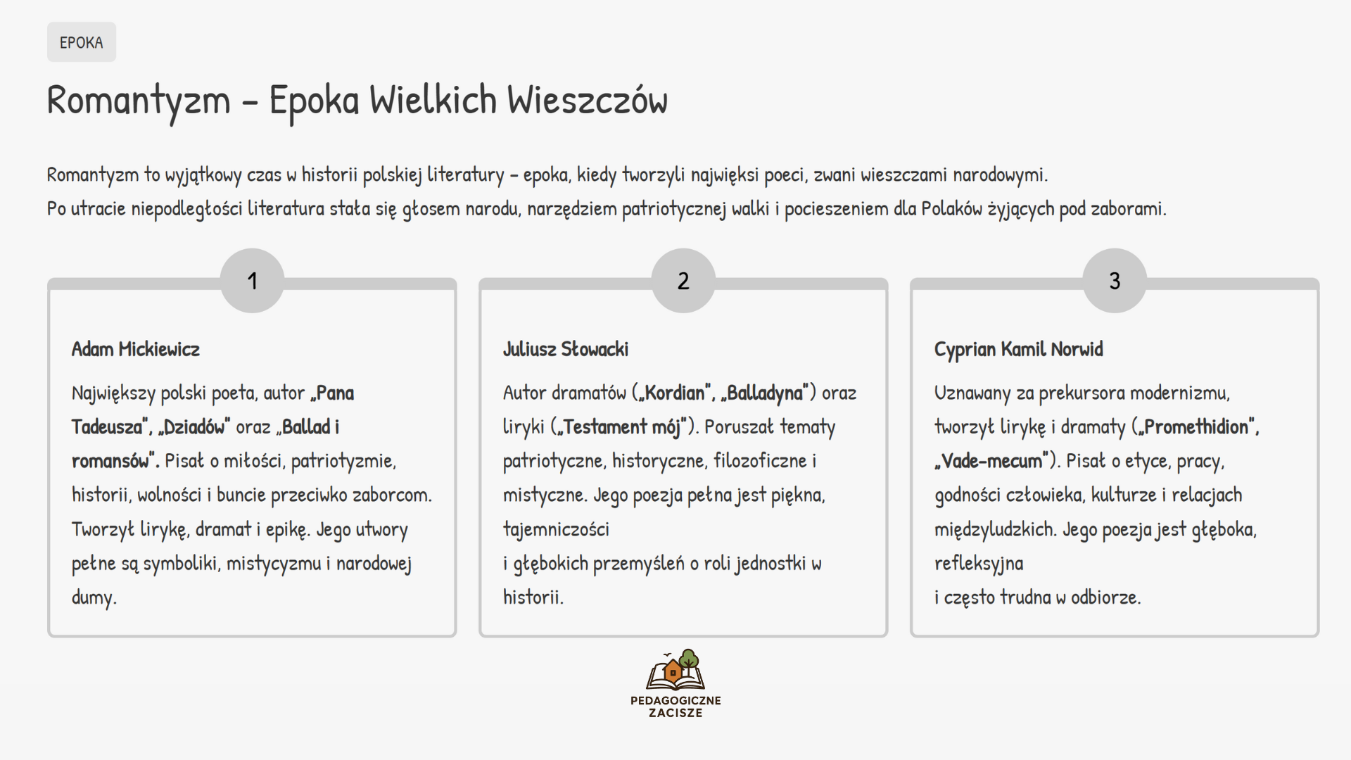 Materiał idealnie sprawdzi się podczas powtórek przed testem, na lekcjach języka polskiego, zajęciach dodatkowych oraz do samodzielnej nauki. Pomaga uporządkować wiedzę, utrwalić kluczowe informacje i przygotować się do zadań dotyczących lektur, epok i motywów literackich.