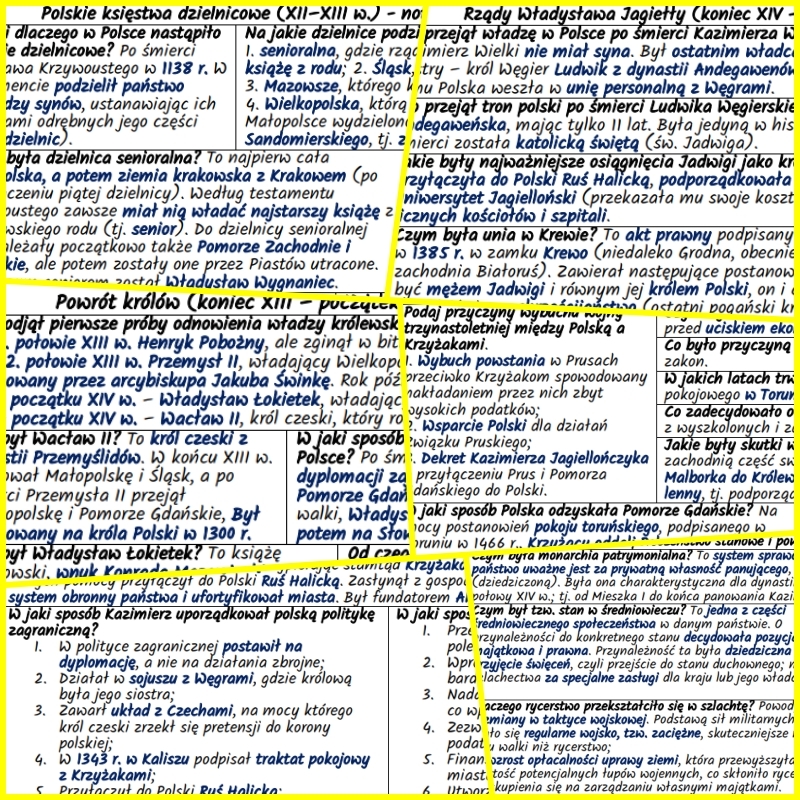 Zestaw notatek w formie pytań i odpowiedzi do zagadnień związanych z rozbiciem dzielnicowym, ostatnimi Piastami na tronie polskim oraz historią Polski w czasach Jagiellonów przygotowany dla klasy 5 według podstawy programowej nauczania historii w szkole podstawowej (Podstawa programowa – Historia – Szkoła podstawowa IV-VIII).