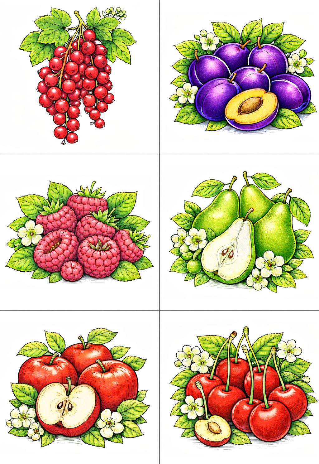 „Polskie owoce – karty do kolorowania” to zestaw ilustracji PDF do druku, przedstawiających popularne owoce z polskich sadów i ogrodów. Materiał zawiera łącznie 8 stron: 6 dużych kart do kolorowania (jabłka, gruszki, śliwki, czereśnie/wiśnie, porzeczki oraz maliny/jeżyny) oraz 2 dodatkowe strony z miniaturami w dwóch układach/rozmiarach, które świetnie sprawdzą się jako szybkie karty pracy, etykiety do podpisywania lub elementy do wycinania. Zestaw jest przeznaczony dla dzieci w wieku przedszkolnym i wczesnoszkolnym (3–9 lat), do pracy w klasie, świetlicy lub w domu. Kolorowanki rozwijają motorykę małą i grafomotorykę, koordynację ręka–oko, koncentrację, spostrzegawczość oraz poszerzają słownictwo i wiedzę przyrodniczą. Jak pracować z materiałem: wydrukuj wybrane strony, porozmawiajcie o tym, jakie to owoce i gdzie rosną, a następnie kolorujcie (można dodać zadania typu liczenie owoców, cieniowanie kolorów lub dorysowanie tła). Miniatury wykorzystaj jako krótkie ćwiczenia, podpisy, fiszki albo dekorację.