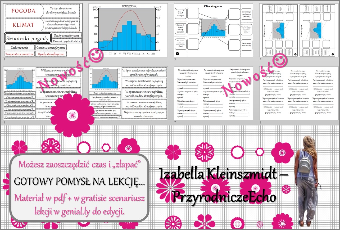 Witajcie Nazywam się Izabella Kleinszmidt (PrzyrodniczeEcho). Jestem nauczycielem przyrody, biologii, geografii i chemii w szkole podstawowej w Pomysku Wielkim. Uwielbiam mój zawód i cieszę się, że robię w życiu to co kocham. Pasja dla nauczyciela jest bardzo ważna:). Prowadzę stronę PrzyrodniczeEcho na FB, nagrywam filmiki do lekcji, konstruuję prezentacje i lekcje multimedialne, escape roomy oraz sketchnotki i karty pracy w programie power point. Zapraszam na stronę internetową mojej szkoły, gdzie znajdują się (niektóre darmowe) opracowania lekcji do przyrody, biologii, geografii i chemii w SP. Adres strony internetowej: https://sppomyskwielki.edu.pl - zakładka - dla ucznia. Od niedawna zapraszam również na moją stronę internetową: https://ikleinszmidt.wixsite.com/przyrodniczeecho Zapraszam do korzystania z mojej pracy:) Bardzo proszę również czytać opisy, aby wiedzieć, jaki materiał znajduje się w danym pliku. Zachęcam do kontaktu w razie jakichś pytań lub błędów w pomocach - brakach lub literówkach-wszystko można naprawić? Jakich materiałów możecie Państwo oczekiwać? SKETCHNOTKA - notatka kompletna z określonego tematu KARTA PRACY - zazwyczaj sketchnotka z wykropkowanymi miejscami PREZENTACJA MULTIMEDIALNA - kompletne wiadomości do odpowiedniego tematu wraz z grafiką i tekstem - zarówno w power point jak i genially - tę koniecznie należy zapisać na swoim koncie! LEKCJA MULTIMEDIALNA - pomysł na przeprowadzenie lekcji - taki "tok lekcji" - skrócony scenariusz ZESTAWY - proszę się wczytać w opis, informuję co mieści się w konkretnym zestawie:) Pozdrawiam cieplutko:)