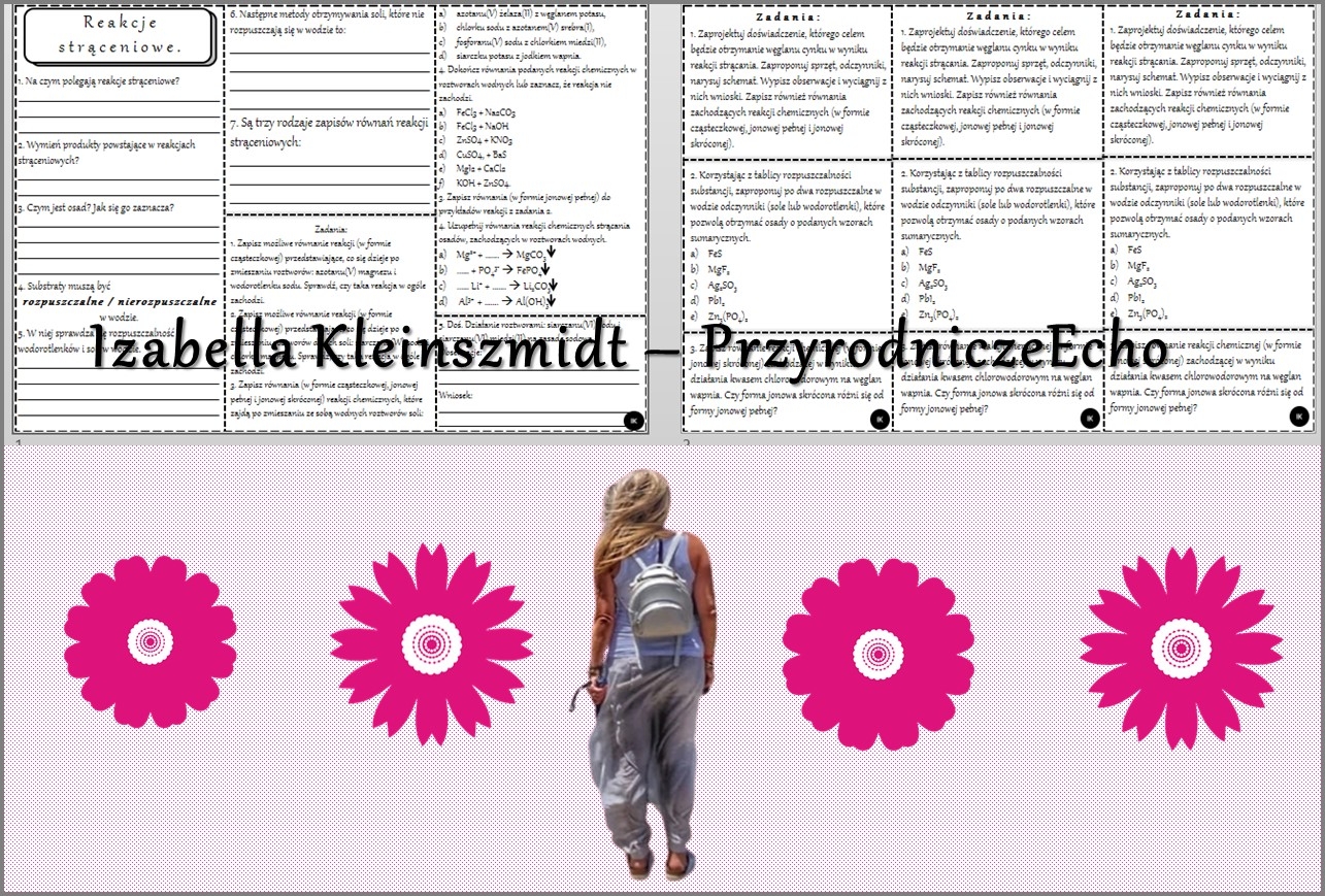 Witajcie Nazywam się Izabella Kleinszmidt (PrzyrodniczeEcho). Jestem nauczycielem przyrody, biologii, geografii i chemii w szkole podstawowej w Pomysku Wielkim. Uwielbiam mój zawód i cieszę się, że robię w życiu to co kocham. Pasja dla nauczyciela jest bardzo ważna:). Prowadzę stronę PrzyrodniczeEcho na FB, nagrywam filmiki do lekcji, konstruuję prezentacje i lekcje multimedialne, escape roomy oraz sketchnotki i karty pracy w programie power point. Zapraszam na stronę internetową mojej szkoły, gdzie znajdują się (niektóre darmowe) opracowania lekcji do przyrody, biologii, geografii i chemii w SP. Adres strony internetowej: https://sppomyskwielki.edu.pl - zakładka - dla ucznia. Od niedawna zapraszam również na moją stronę internetową: https://ikleinszmidt.wixsite.com/przyrodniczeecho Zapraszam do korzystania z mojej pracy:) Bardzo proszę również czytać opisy, aby wiedzieć, jaki materiał znajduje się w danym pliku. Zachęcam do kontaktu w razie jakichś pytań lub błędów w pomocach - brakach lub literówkach-wszystko można naprawić? Jakich materiałów możecie Państwo oczekiwać? SKETCHNOTKA - notatka kompletna z określonego tematu KARTA PRACY - zazwyczaj sketchnotka z wykropkowanymi miejscami PREZENTACJA MULTIMEDIALNA - kompletne wiadomości do odpowiedniego tematu wraz z grafiką i tekstem - zarówno w power point jak i genially - tę koniecznie należy zapisać na swoim koncie! LEKCJA MULTIMEDIALNA - pomysł na przeprowadzenie lekcji - taki "tok lekcji" - skrócony scenariusz ZESTAWY - proszę się wczytać w opis, informuję co mieści się w konkretnym zestawie:) Pozdrawiam cieplutko:)