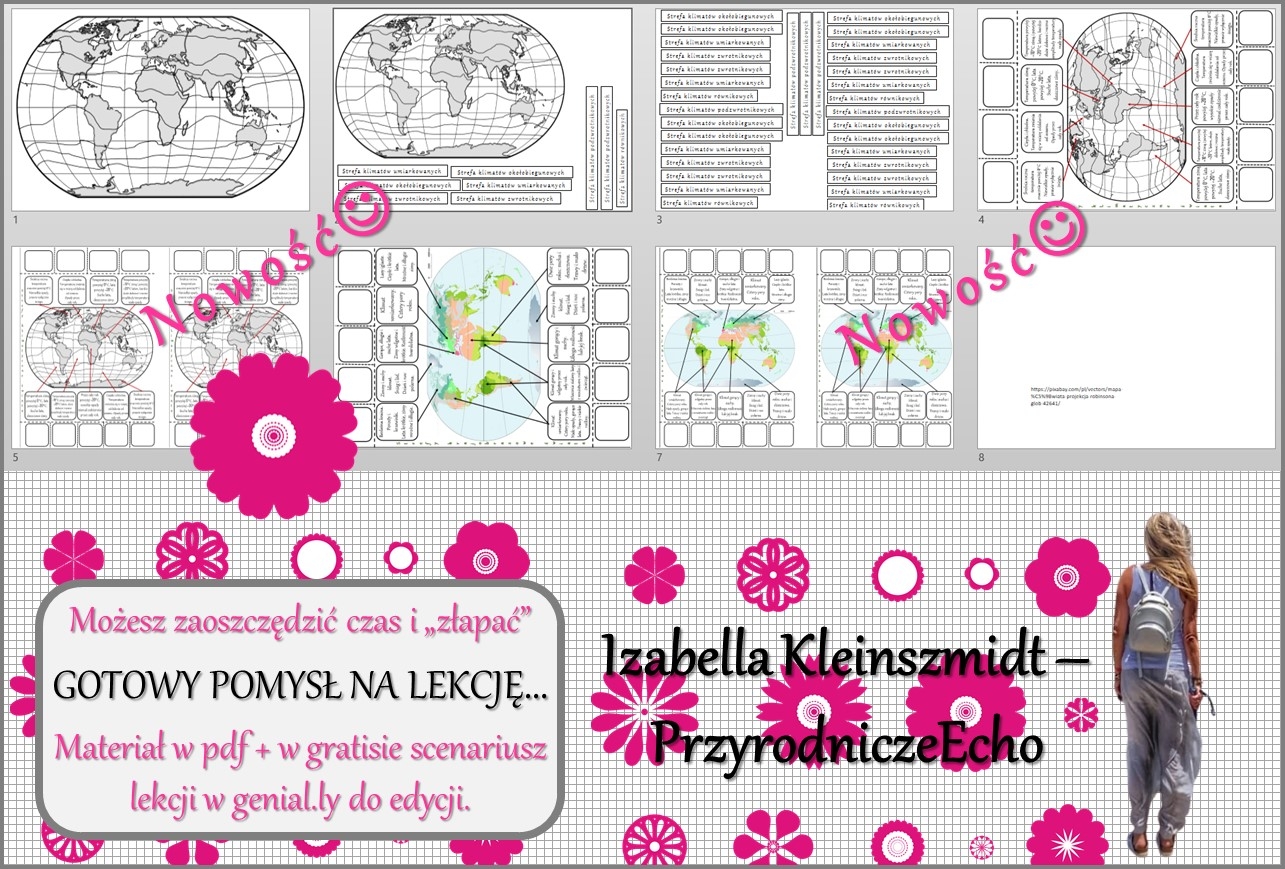 Pomysł na lekcję/karta pracy/stacje zadaniowe/notatki/ materiał do lekcji do tematu „Strefy klimatyczne i krajobrazowe” w pdf. W gratisie niekomercyjny scenariusz lekcji/pomysł na lekcję w programie genial.ly do edycji. Geografia 5. Dział „Krajobrazy świ