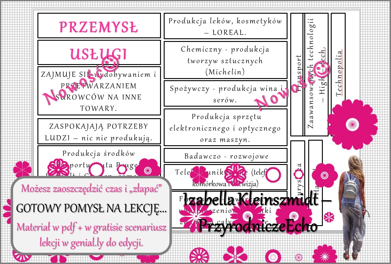Pomysł na lekcję/karta pracy/stacje zadaniowe/notatki/ materiał do lekcji do tematu „Przemysł i usługi we Francji"” w pdf. W gratisie niekomercyjny scenariusz lekcji/pomysł na lekcję w programie genial.ly do edycji. Geografia 6. Dział „Gospodarka Europy”