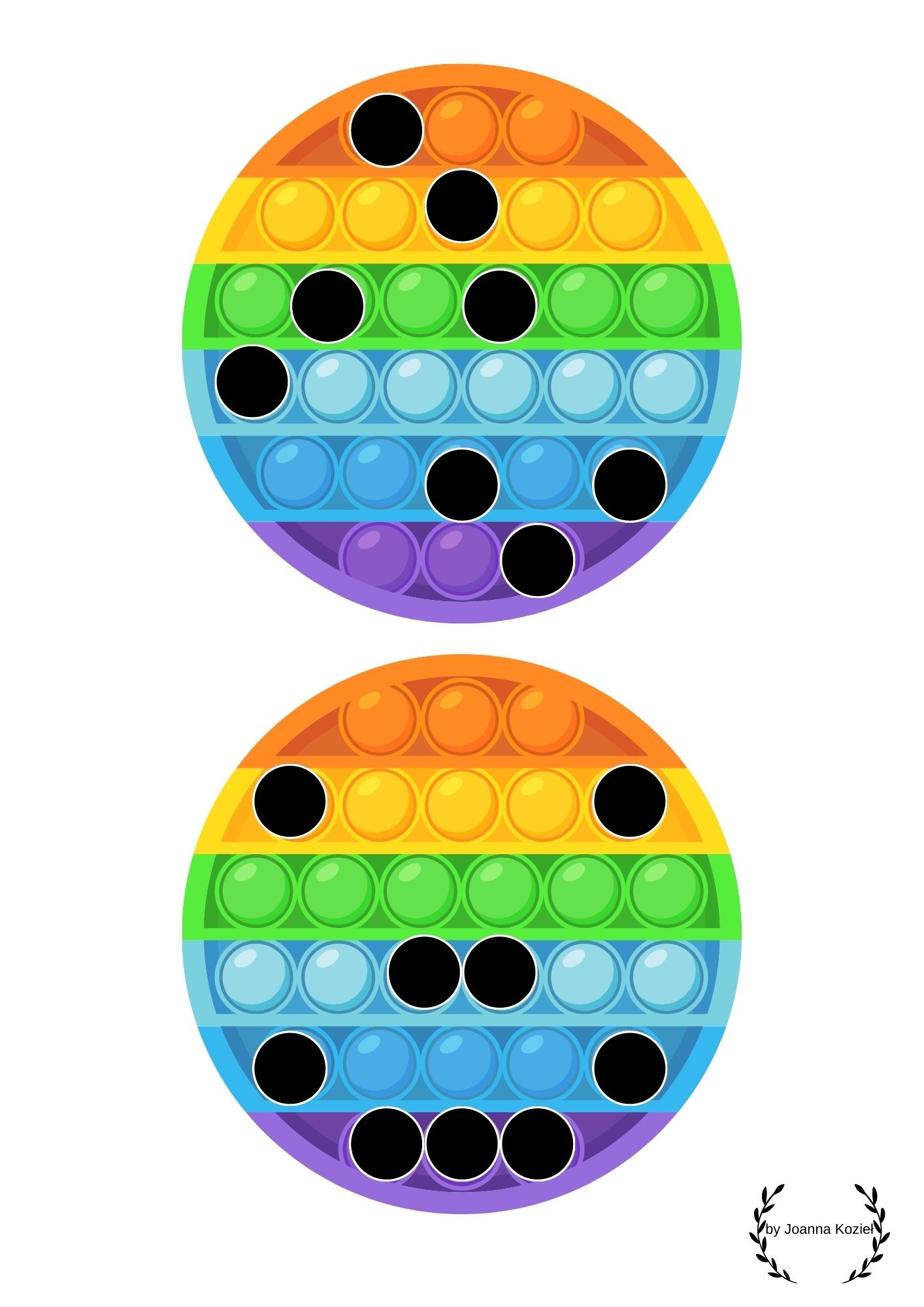 Zestaw kart pracy do popularnej gry pop it w najbardziej uniwersalnym kształcie koła. W kolorze do samodzielnego wydruku i zalaminowania. Zestaw zawiera 30 kart po 2 układy na stronie łącznie 60 układów pozwalających kształtować koordynację wzrokowo-ruchową, cierpliwość, uważność. Przydatne w terapii indywidualnej, pracy w domu, szkole, świetlicy szkolnej