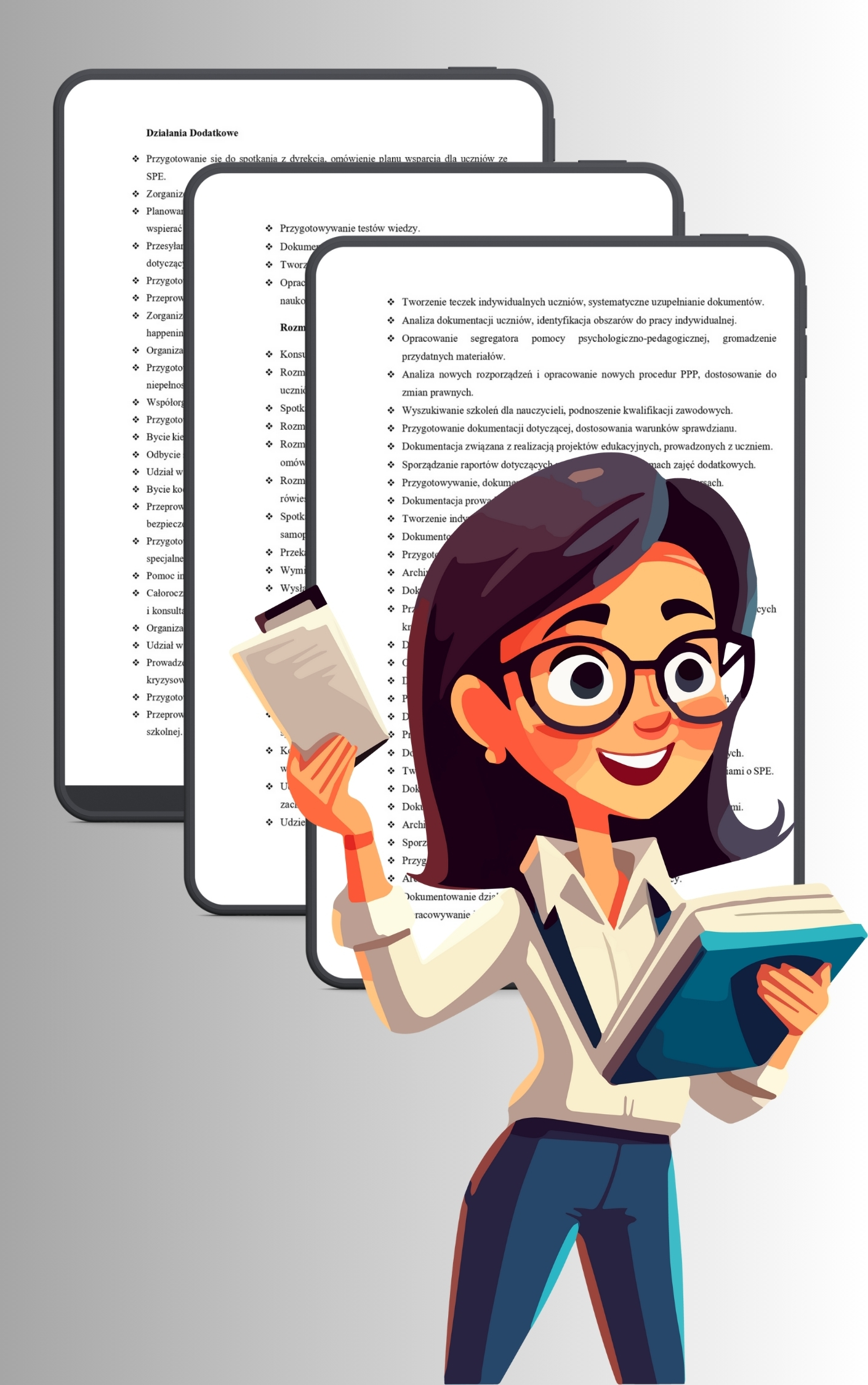 Jako pedagog z wieloletnim doświadczeniem, doskonale rozumiem wyzwania, z jakimi mierzysz się każdego dnia. Wiem, jak trudno jest pogodzić formalności z prawdziwą pasją, jaką jest wspieranie uczniów ze specjalnymi potrzebami edukacyjnymi. Dlatego stworzyłam ten e-book – z myślą o Tobie i Twojej codziennej pracy.