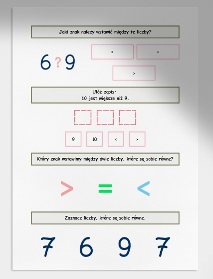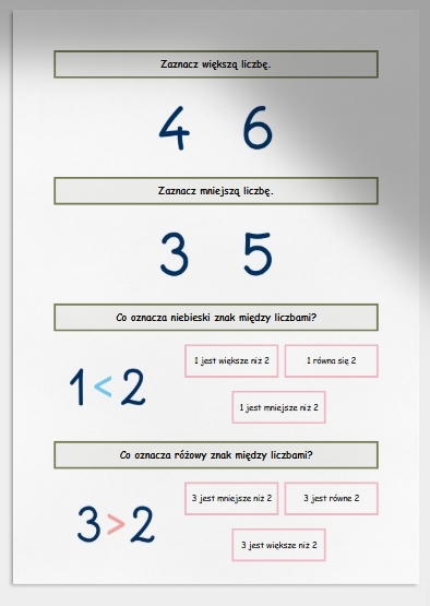 Materiał zawiera zadania typu: 🟢 "Zaznacz większą/mniejszą liczbę"