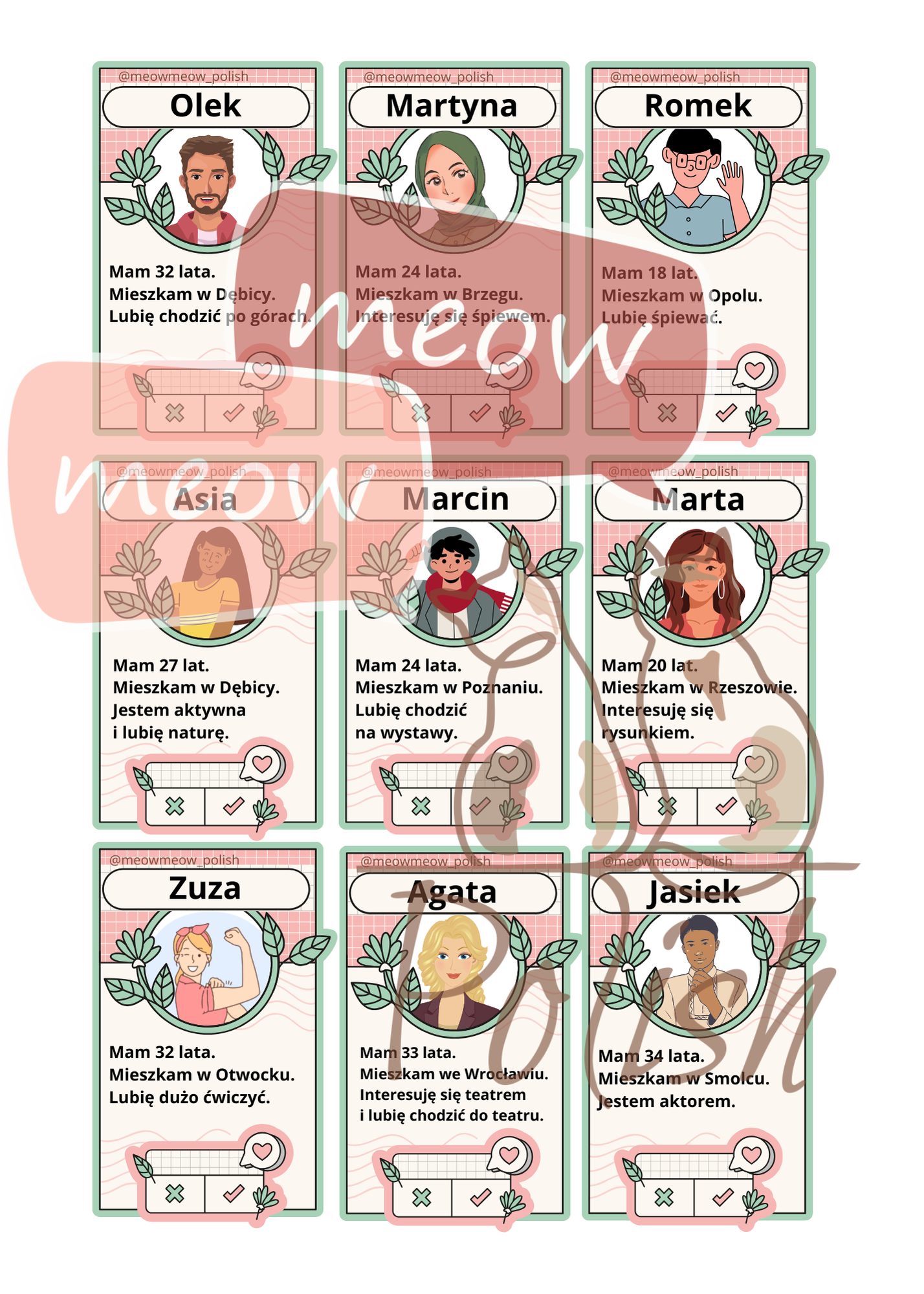 Karty przedstawiają 30 osób (mężczyźni oraz kobiety). Co więcej, ostatnia strona obejmuje puste karty, które uczniowie mogą wypełnić swoimi pomysłami. Karty przypominają konta aplikacji randkowej. Zabawa polega na połączeniu w pary osób o podobnych zainteresowaniach. Kto z kim byłby szczęśliwy?